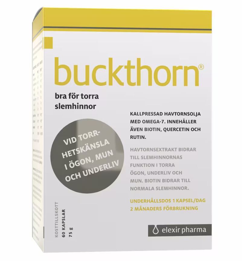 Buckthorn från Elexir Pharma är ett kosttillskott med extrakt från ekologiska havtornsbär. Buckthorn innehåller Rutin och Quercetin från bovete. Elexir Buckthorn är även förstärkt med biotin som bidrar till slemhinnornas normala funktion. Slemhinnor har vi bland annat i ögonen, munnen och underlivet.