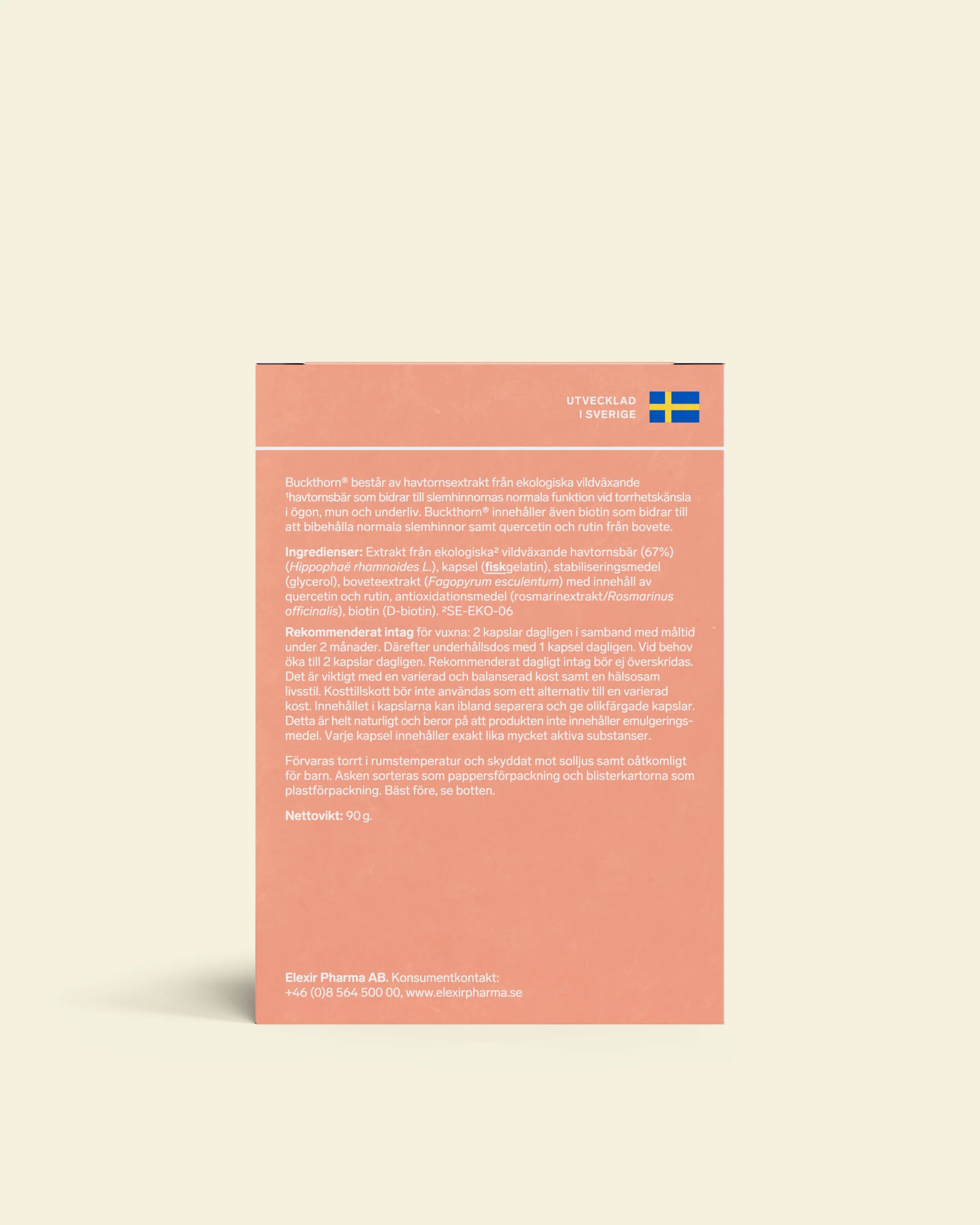 Det som gör Elexir Buckthorn speciellt är inte bara den höga halten av havtornsolja, utan även kombinationen med noga utvalda näringsämnen. Formulan är förstärkt med biotin (vitamin B7), som är vetenskapligt erkänt för att bidra till att bibehålla normala slemhinnor. Dessutom innehåller kapslarna quercetin och rutin från bovete, två bioflavonoider som samverkar med havtornets naturliga antioxidanter för att skydda cellerna mot oxidativ stress. För en komplett omsorg om din hälsa kan produkten med fördel kombineras med Elexir Pharma Blue Eye vid torra ögon eller andra specifika kosttillskott för klimakteriet.