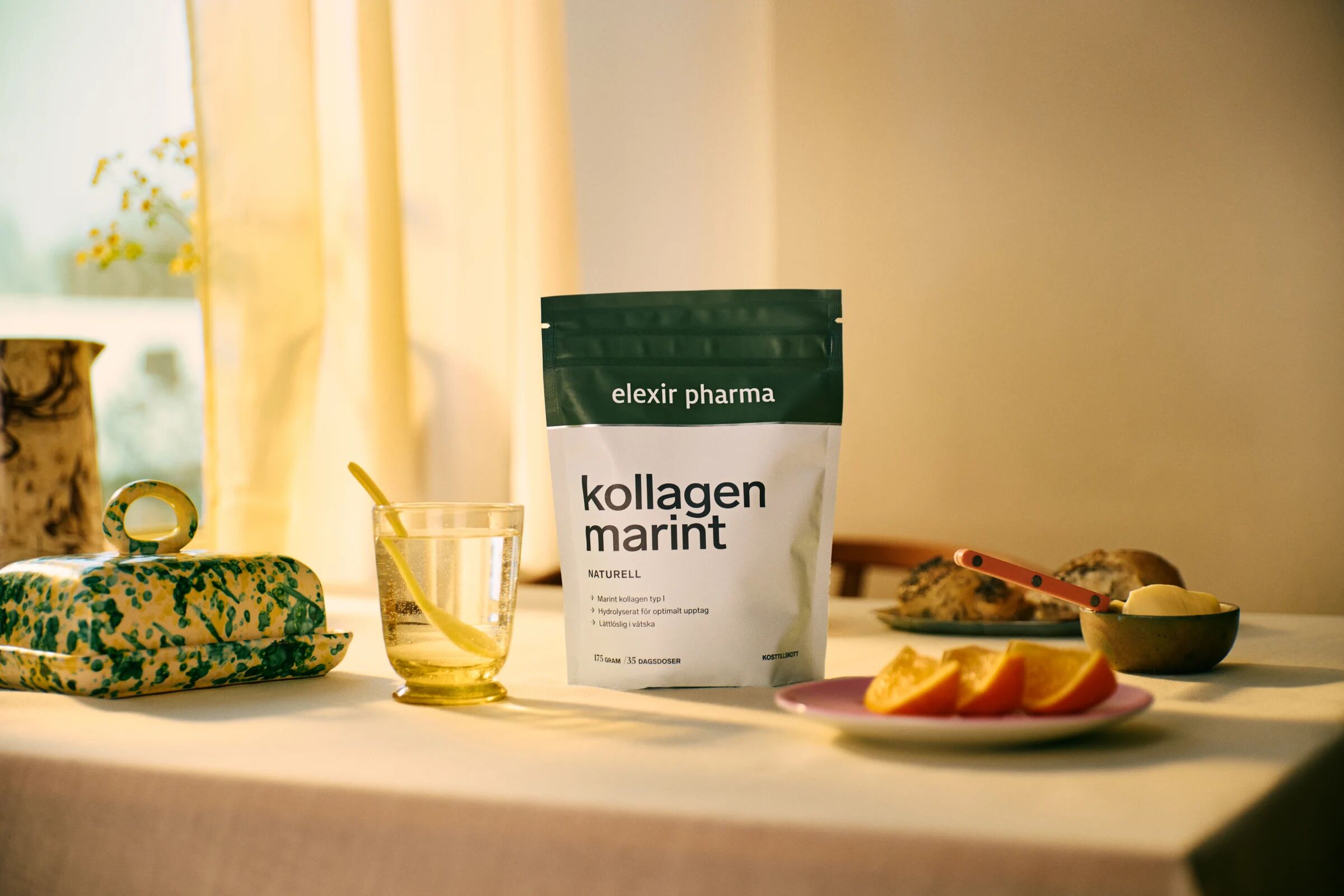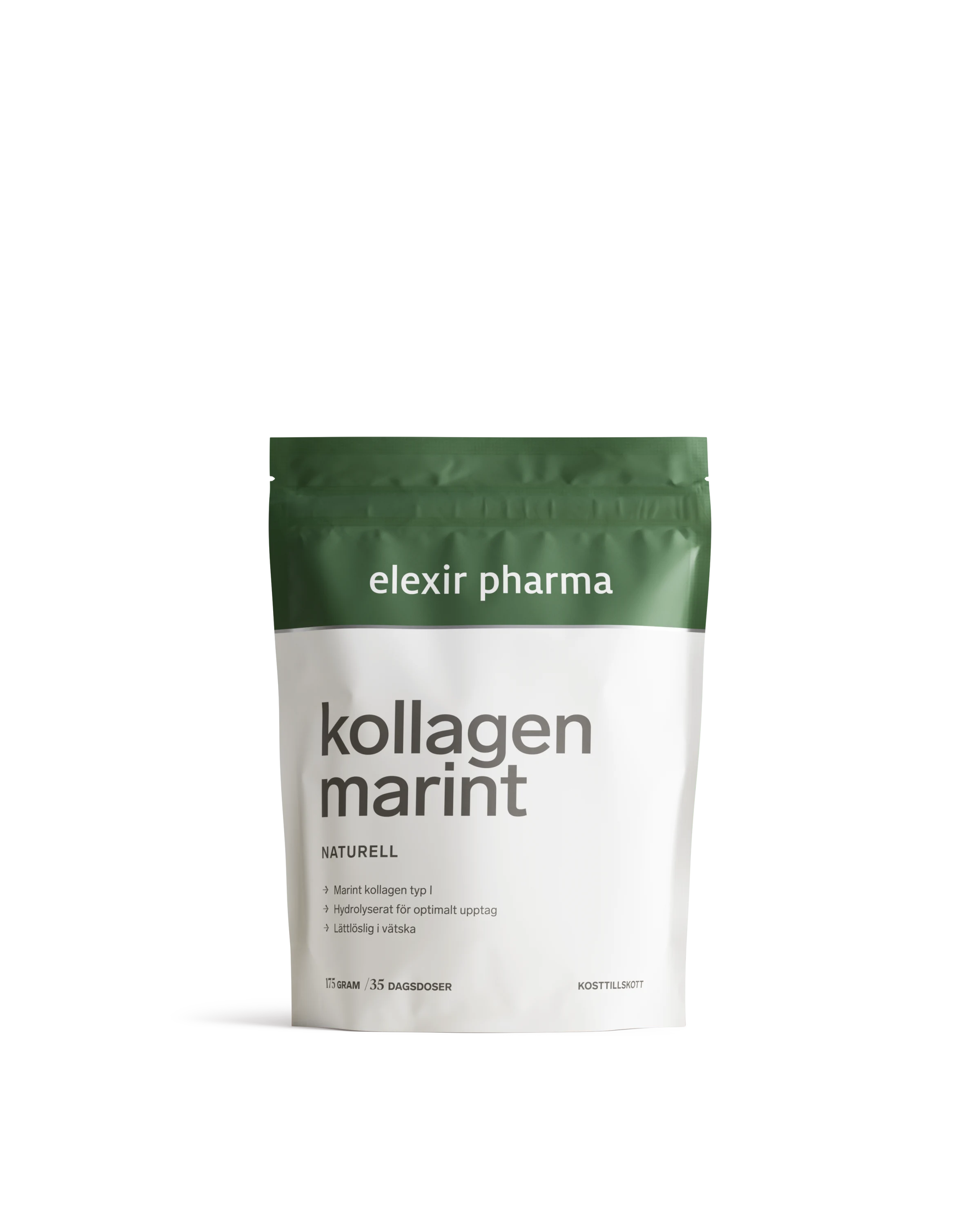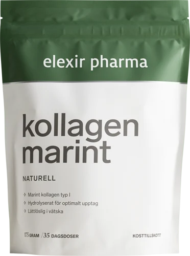 Elexir Kollagen består av 100% marint kollagen typ I. Kollagenet utvinns ur hållbart odlad sötvattensfisk. Elexir Kollagen är hydrolyserat (nedbrutet) för bättre upptag i kroppen och löses lätt upp i vatten, juice, smoothie eller annan valfri vätska. Neutral smak.