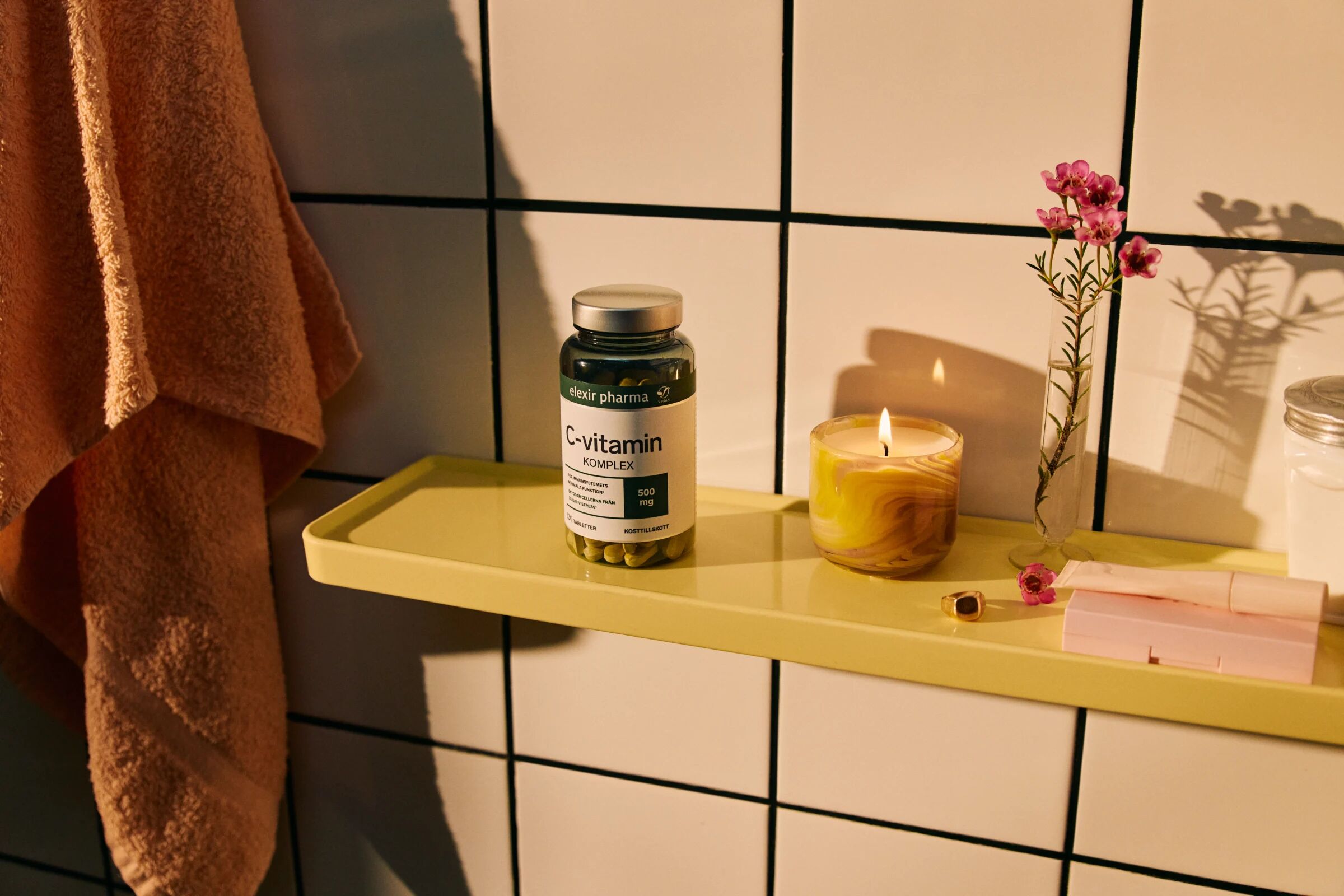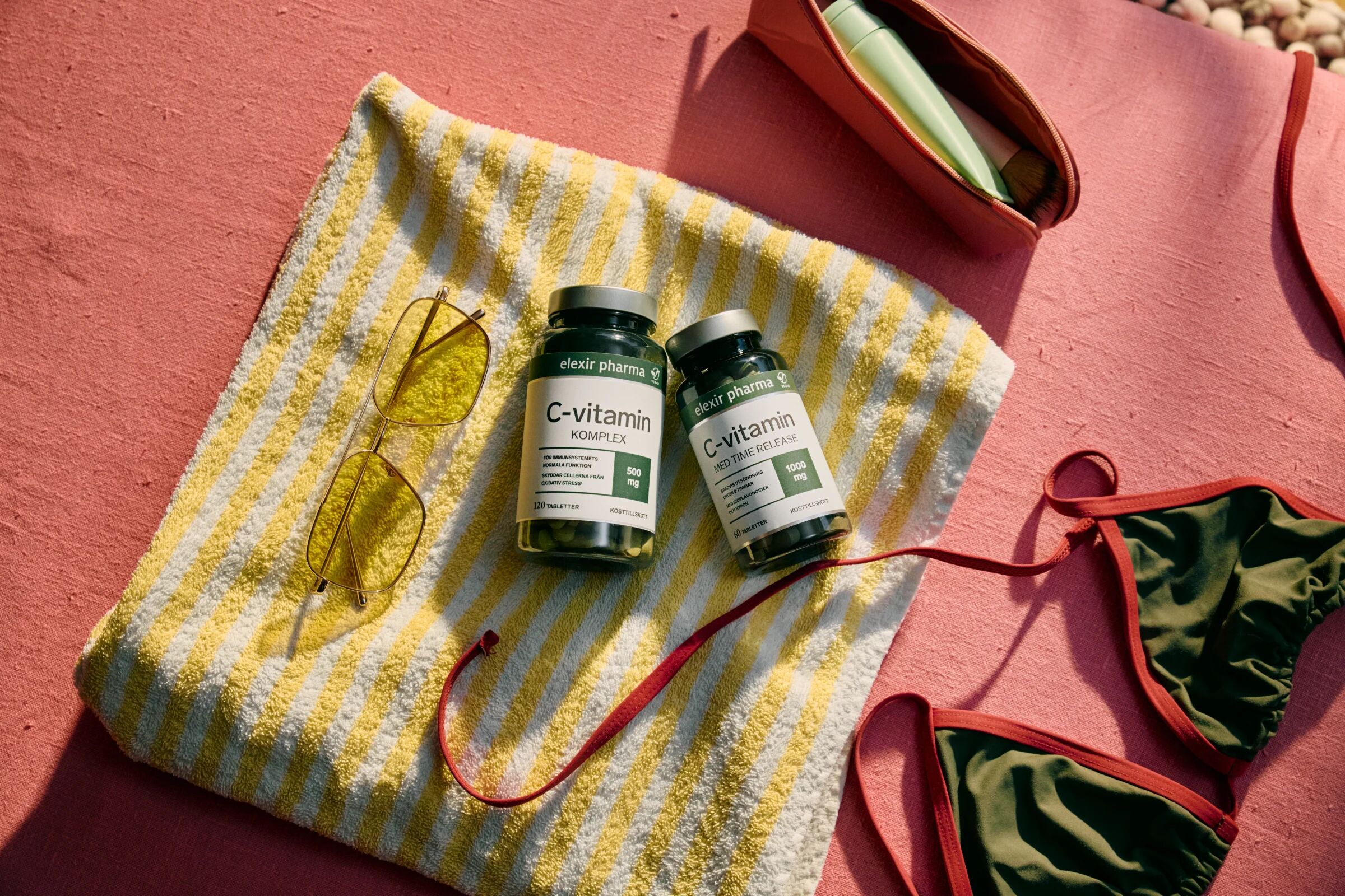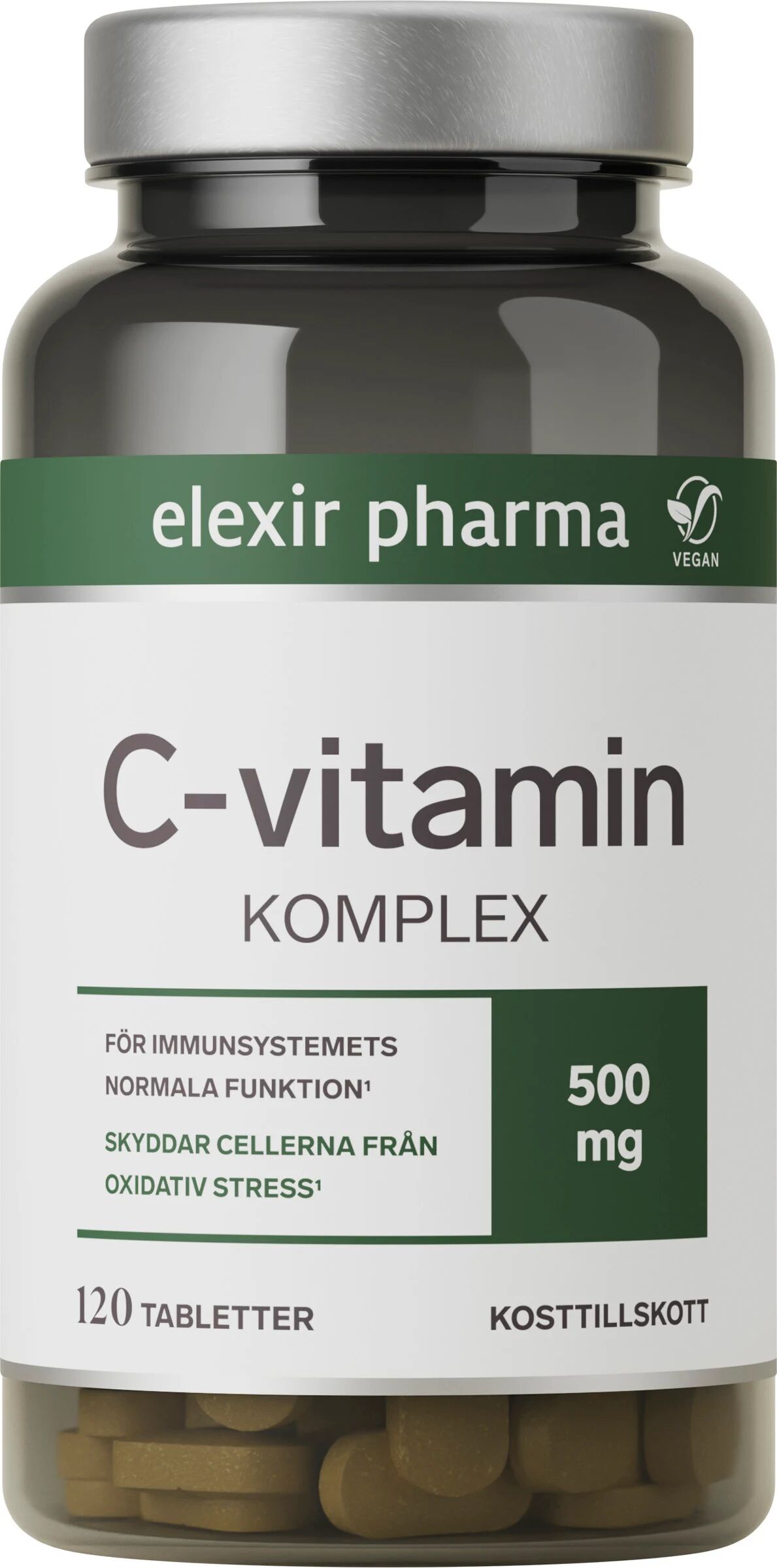 Elexir C vitamin komplex innehåller 500 mg vitamin C per tablett kompletterat med bioflavonoider. Vitamin C verkar som antioxidant och skyddar cellerna mot oxidativ stress och bidrar till att immunsystemet fungerar normalt. Vitamin C bidrar också till att minska trötthet och utmattning.