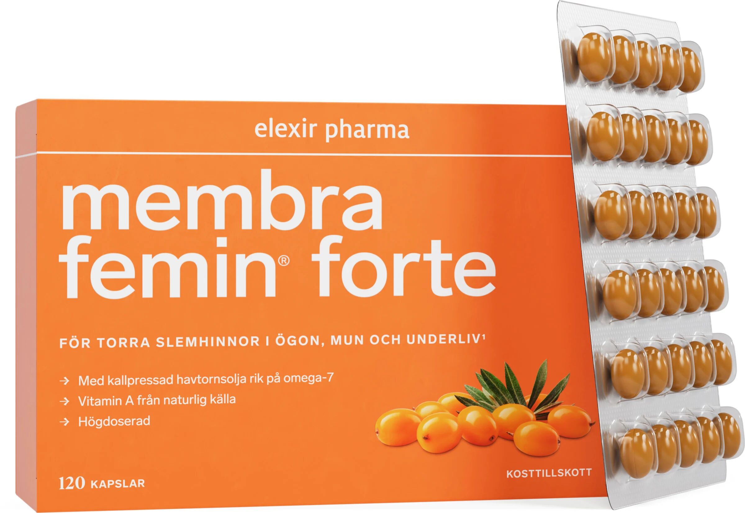 Elexir Membra Femin Forte är ett högeffektivt kosttillskott framtaget för att bibehålla och stärka slemhinnornas funktion i hela kroppen. Många kvinnor upplever besvär med torrhetskänsla i ögon, mun och underliv, särskilt i samband med hormonella förändringar. Detta tillskott från Elexir Pharma baseras på det patenterade havtornsextraktet OTPI-7® som är naturligt rikt på den unika fettsyran omega-7.