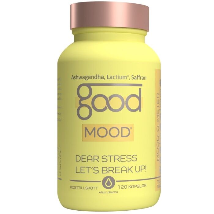 Good Mood från Elexir Pharma är ett kosttillskott baserat på ashwagandha, saffran och rosenrot, tillsammans med Lactium. Lactium® är namnet på en patenterad bioaktiv peptid från råmjölk, extraherad från mjölkproteinet kasein. (Lactium® innehåller mindre än 0,5% laktos.)