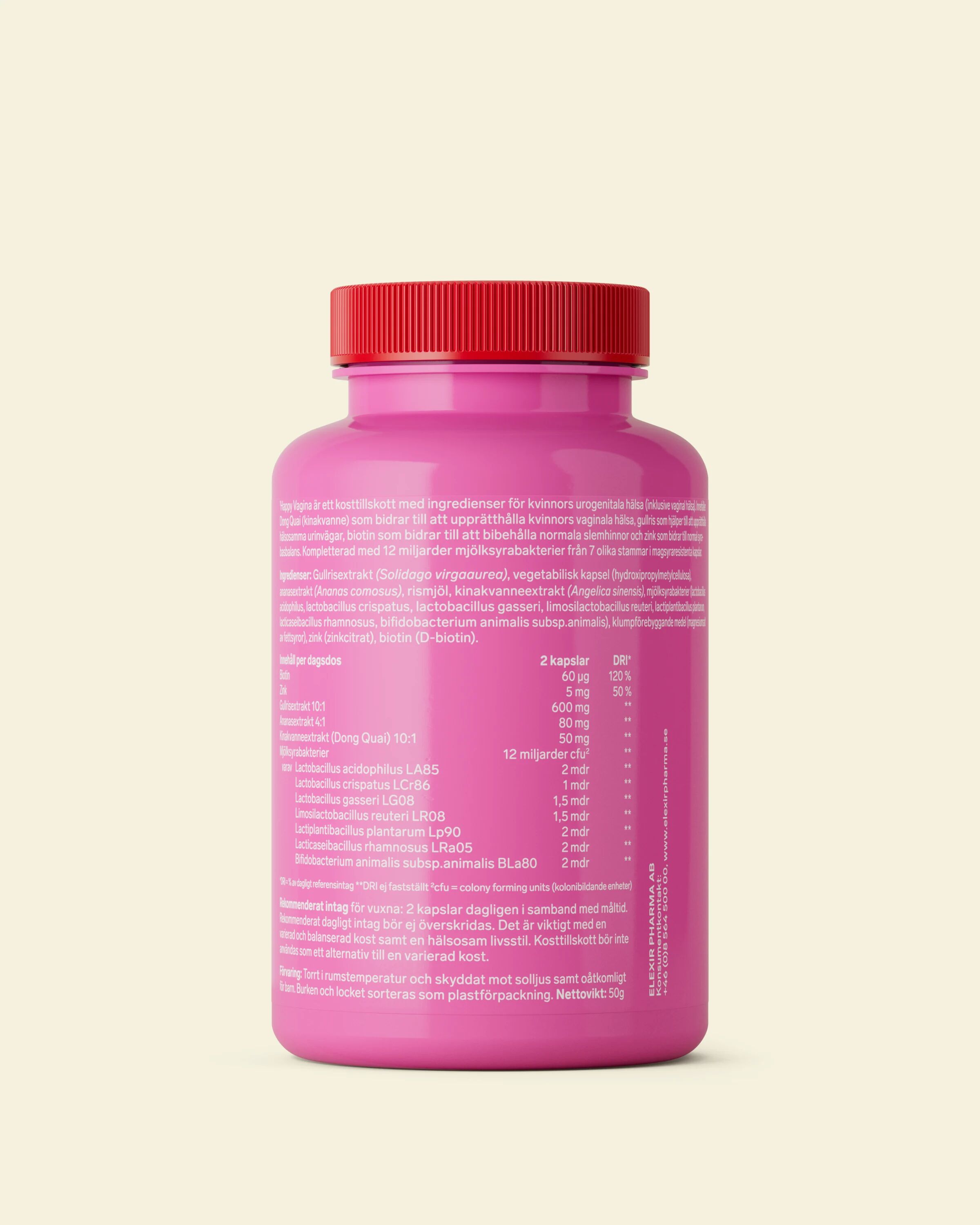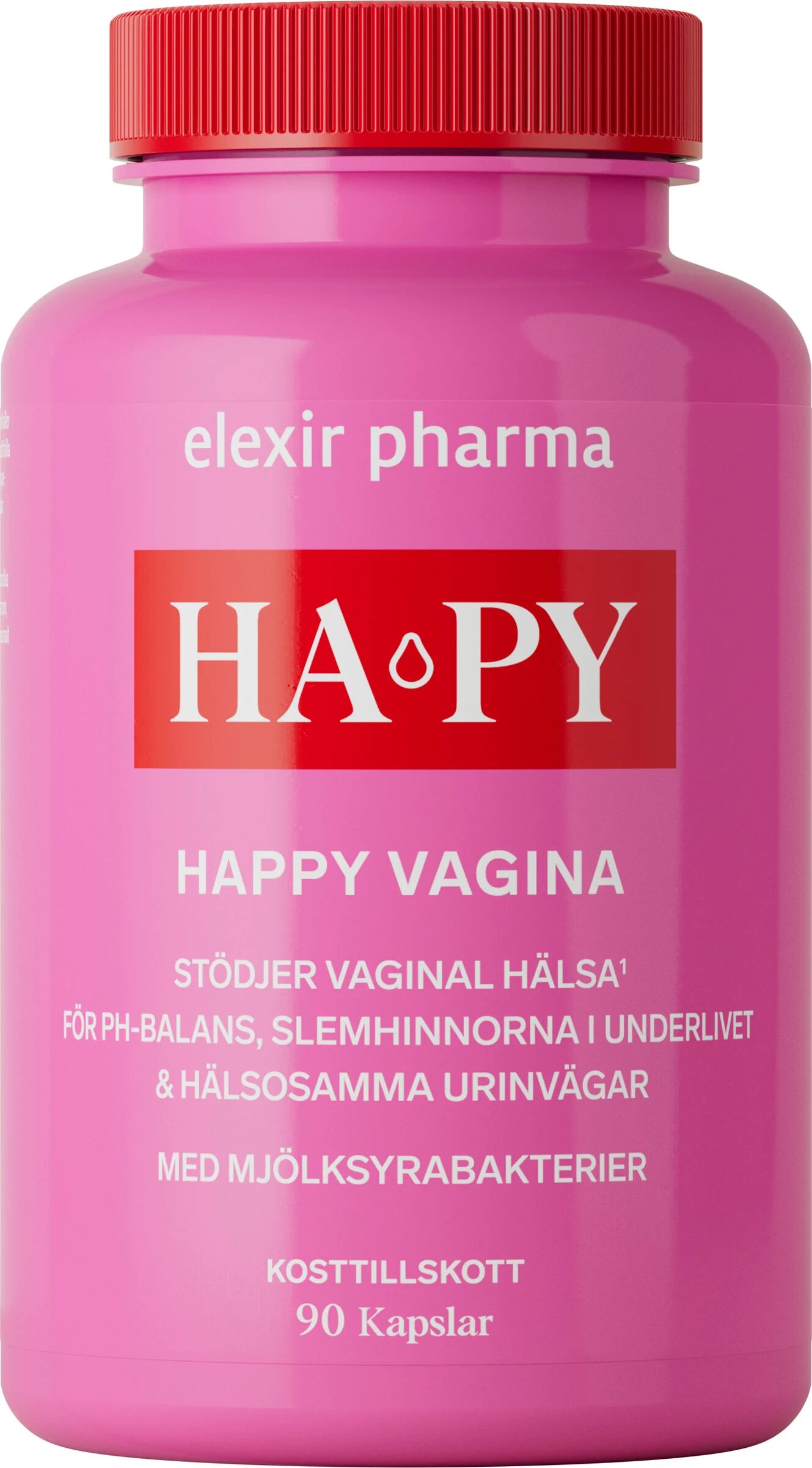 Kosttillskott HA-PY (Happy Vagina) från Elexir Pharma innehåller 12 miljarder mjölksyrabakterier från 7 olika, noga utvalda bakteriestammar. Produkten innehåller dessutom örten Dong Quai, även kallad ”kvinnlig ginseng”, gullris, biotin och zink. Biotin är en B-vitamin som bidrar till slemhinnornas normala funktion. Zink bidrar till normal pH-balans. Happy vagina är berikad med extrakt från ananas.
