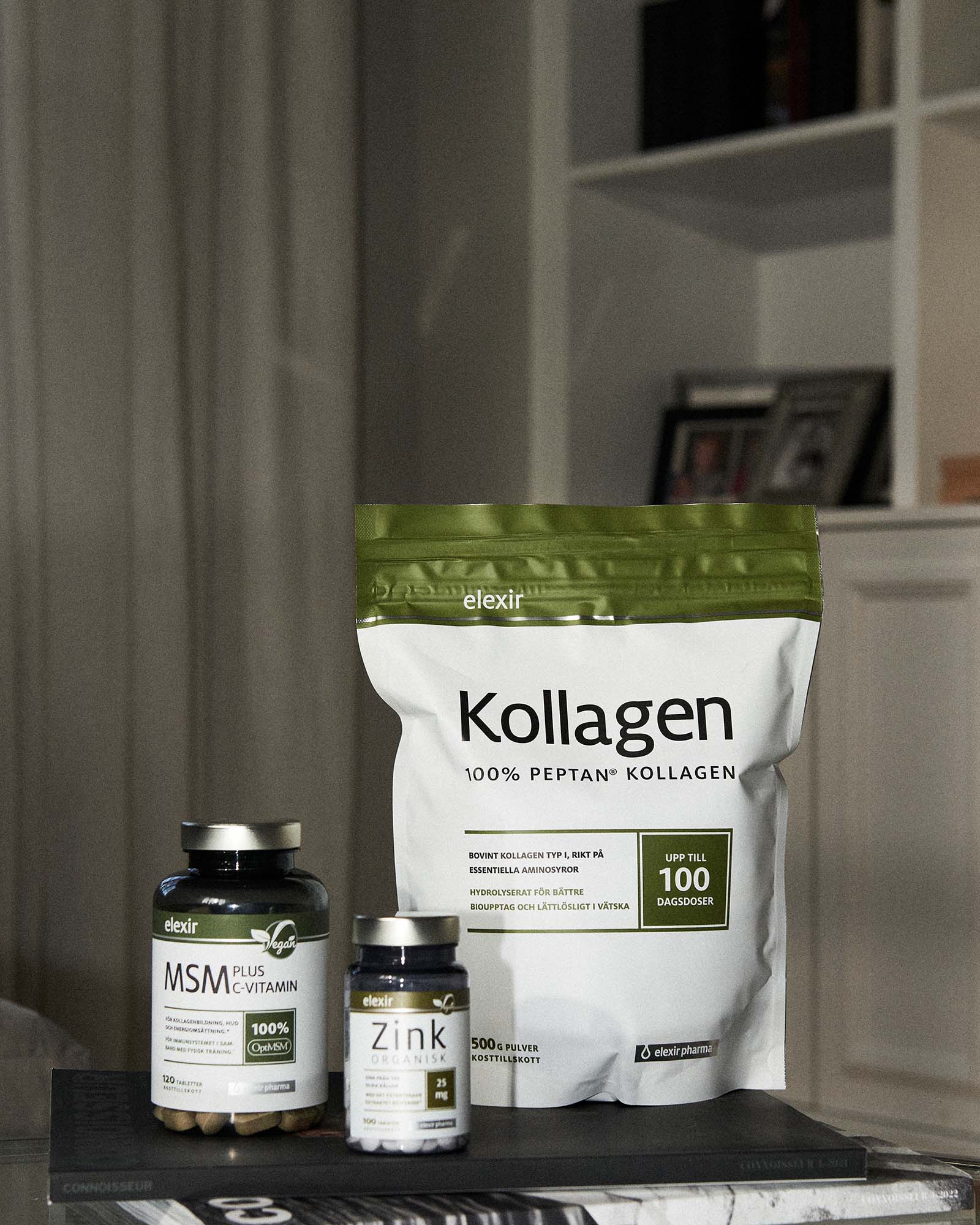 Kollagen återfinns naturligt i hög utsträckning i kroppen. Kollagen är en form av protein som utgör ca en tredjedel av allt protein vi har i oss. Man finner kollagen i hud, hår, muskler, skelett, leder, senor, ligament, tandkött, blodkärlsväggarna och mer. Då kollagen återfinns i så många olika vävnader med olika funktioner så finns det även flera former av kollagen men de vanligast förekommande är 1-3. Kollagen från Elexir Pharma innehåller kollagen typ I.