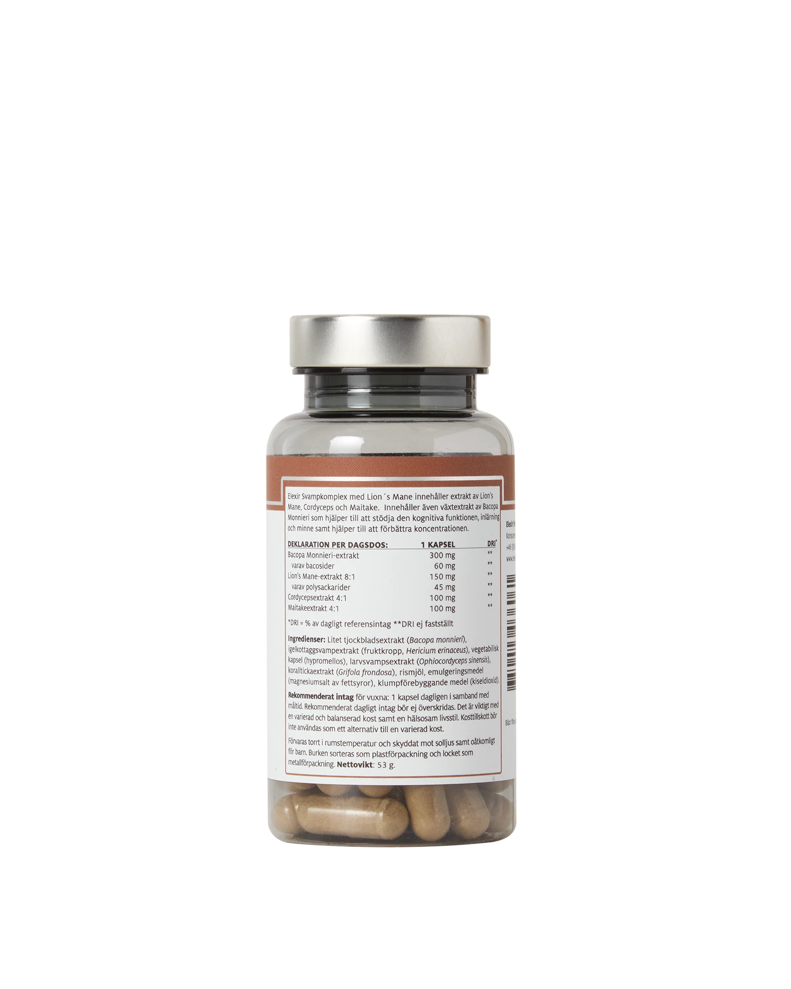 Elexir Svampkomplex med Lion's mane är ett kosttillskott för fokus, minne och förbättrad koncentration. Produkten består av tre olika svampar tillsammans med växtextraktet Bacopa monnieri som hjälper till att stödja den kognitiva funktionen, inlärning och minne samt hjälper till att förbättra koncentrationen.