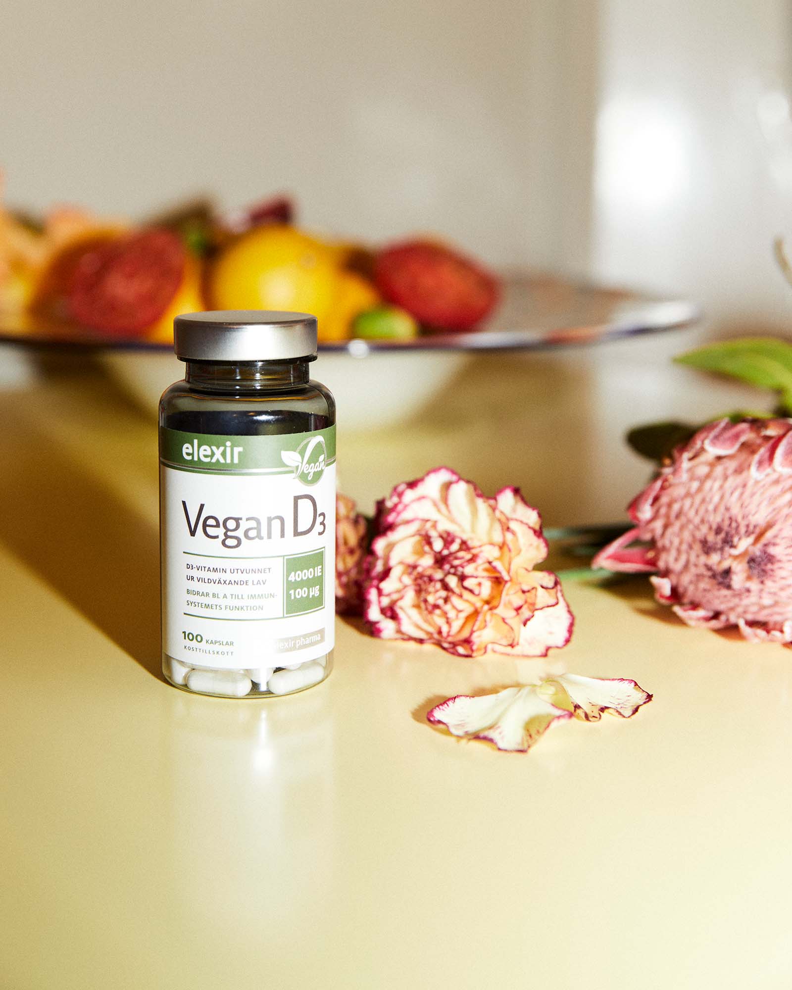 Med aktivt D-vitamin utvunnet ur lav som växer naturligt på stenar och berghällar. Eftersom solen under större delen av året inte står tillräckligt högt i Norden så rekommenderas ett intag av D-vitamin genom kosttillskott. Vitamin D3 rekommenderas i synnerhet till veganer, då vegansk kosthållning har väldigt få naturliga källor till D-vitamin. Kapseln är framställd av cellulosa, ett växtbaserat material som utvinns ur växternas cellväggar