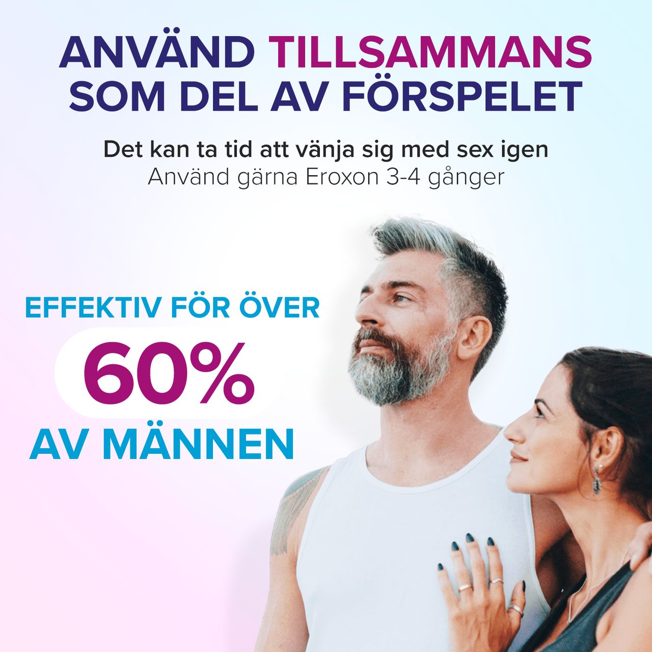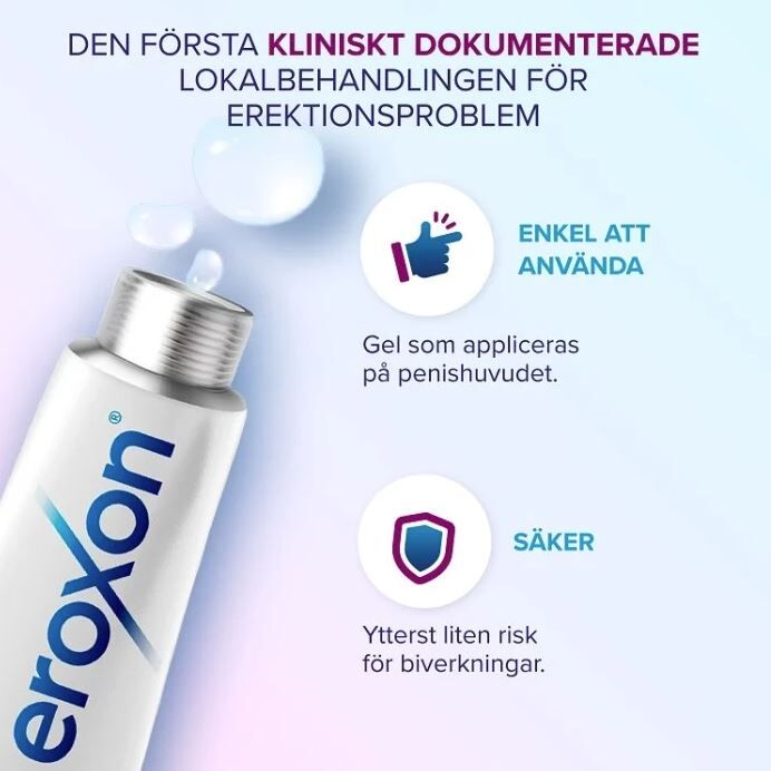 Eroxon® är utformad för män över 18 år som upplever svårigheter att få eller upprätthålla en tillräckligt hård erektion för att obehindrat kunna njuta av sexuella aktiviteter. Med en dokumenterad klinisk effekt kan Eroxon® hjälpa män att få erektion inom 10 minuter. (Kliniskt bevisad effekt hos 60% av män med erektionsproblem.) Visar inga kontraindikationer med läkemedel. Gelen har en formulering med minimala biverkningar för både användaren och partnern. Kan användas som del av förspel, och kan användas tillsammans med glidmedel och latexkondom.