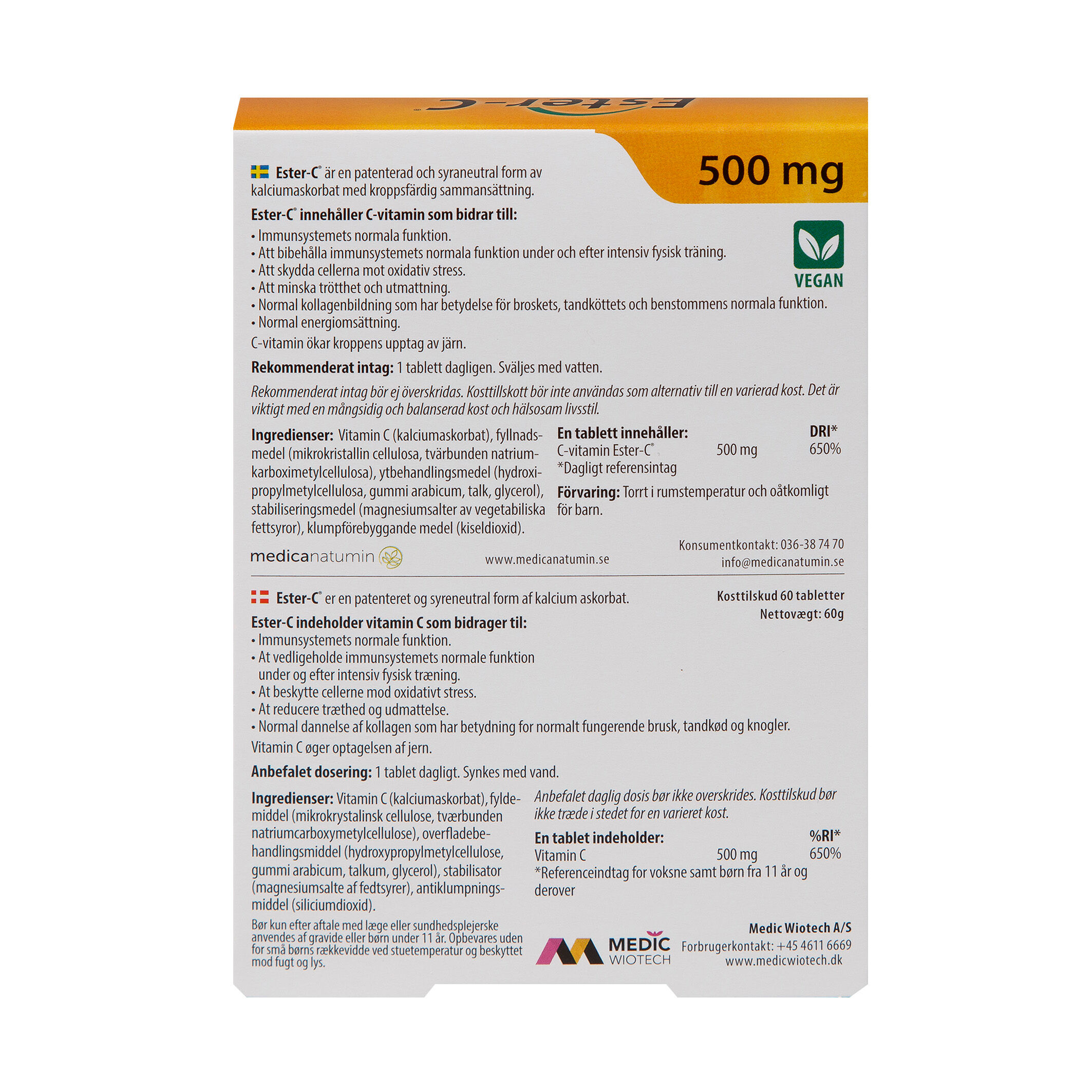 C-vitamin behöver vi extra utav under året i större eller i mindre doser. C-vitamin från Ester-C innehåller ett syraneutralt kalciumaskorbat som lagras i kroppens celler i 24 timmar. Det innebär att endast 1 tablett om dagen räcker. C-vitaminet bidrar till ett ökat immunförsvar, ökar upptaget av järn, har en positiv inverkan på kroppen vid trötthet och utmattningssymptom. Vårda din hälsa och ge din kropp ett extra tillskott. För friska vuxna och barn som vill ha ett extra immunskydd under de kalla årstiderna.
