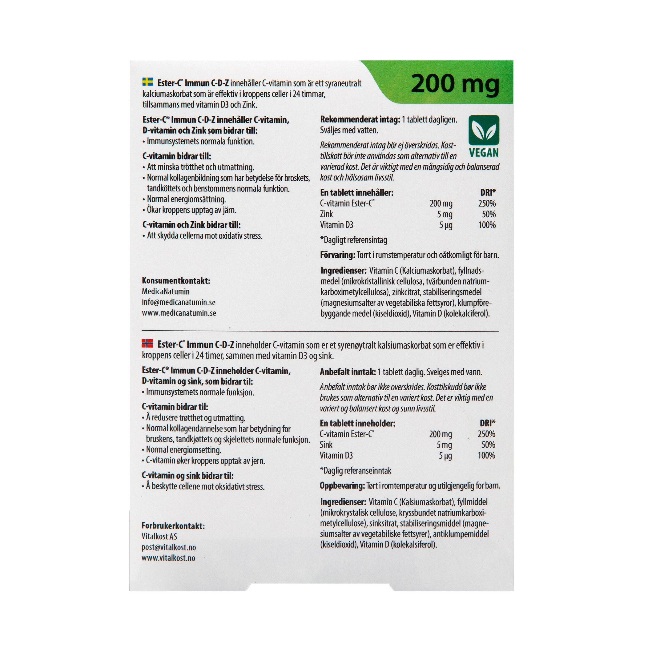 Ester-C Immun C-D-Z innehåller C-vitamin från Ester-C som är ett syraneutralt kalciumaskorbat som lagras i kroppens celler i 24 timmar. Det innebär att endast 1 tablett om dagen räcker. Tabletten innehåller även vitamin D3 och zink som tillsammans med C-vitaminen bidrar till ett stärkt immunförsvar. Ester-C är vegansk och glutenfri.