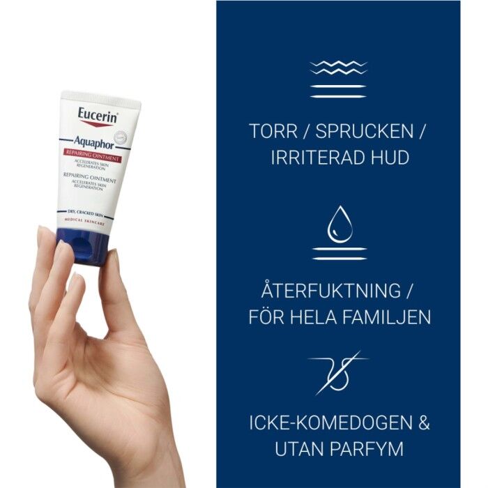 Eucerin Aquaphor Soothing Balm är en gelsalva för torr, sprucken eller irriterad hud. Aquaphor Balm ger huden SOS-vård som hjälper till att stödja hudens egna förnyelseprocess, samtidigt som den skyddar det drabbade området. Den vattenfria formuleringen lugnar och vårdar mycket torr till extremt torr, sprucken eller irriterad hud, genom att hjälpa till att stimulera hudens egna förnyelseprocess. Kan användas för torr och sprucken hud, självsprickor och torra nagelband, hälsprickor och för små barns hud. Dermatologiskt testad.