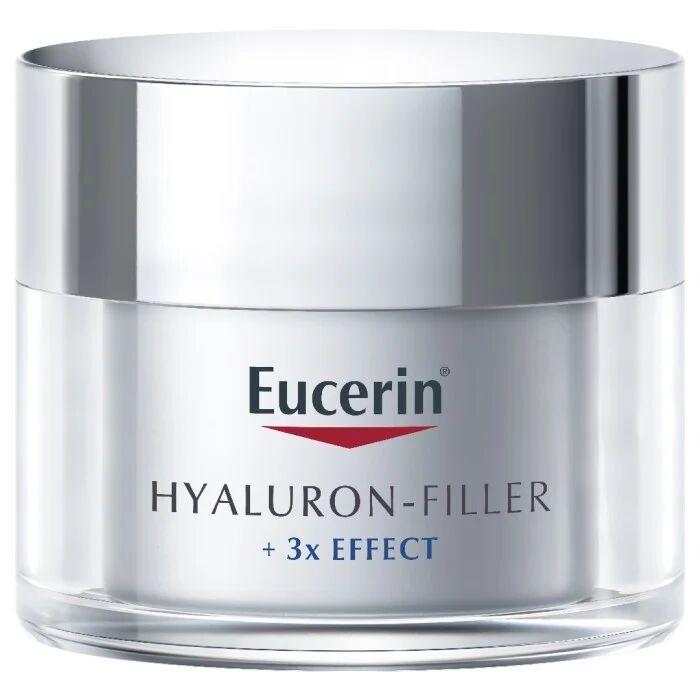Eucerin Hyaluron Filler + 3x Effect Day Cream SPF 15 Dry Skin är en effektiv anti-age dagkräm för torr hud som motverkar hudens åldrande på flera nivåer. När hudens naturliga produktion av hyaluronsyra minskar med åldern uppstår fina linjer och rynkor. Eucerins avancerade 3x Effect-teknologi kombinerar hög- och lågmolekylär hyaluronsyra som återfuktar intensivt och fyller ut rynkor både på ytan och djupare i huden. Krämen innehåller även SPF 15 och UVA-skydd samt antioxidanten saponin som skyddar mot UV-inducerat förtida åldrande och fria radikaler. Ingrediensen enoxolone hjälper till att minska nedbrytningen av hyaluronsyra och bidrar till en slätare, fastare och mer strålande hud.