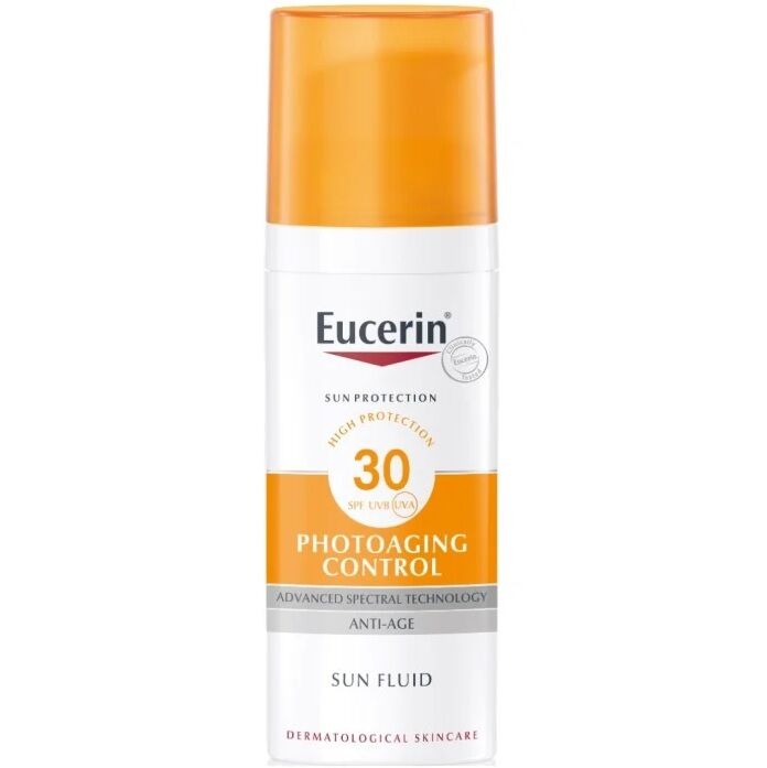 Eucerin Anti Age Sun Fluid SPF 30 är en solkräm för ansiktet. Photoaging Control solkräm har antiage-egenskaper och innehåller de aktiva ingredienserna Licochalcone A som skyddar hudcellerna i de djupare hudlagren i överhuden och hyaluronsyra som tillför huden fukt och reducerar rynkor.