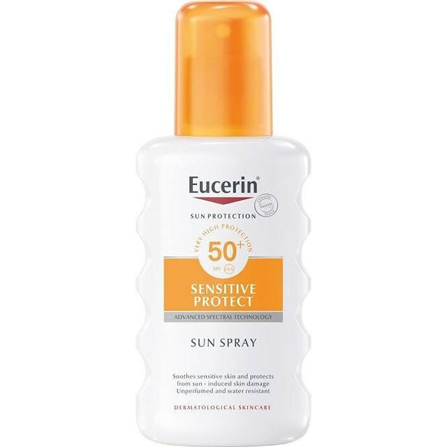 Eucerin Sun Protect Sun Spray SPF50+ är en solspray med mycket högt skydd som lugnar känslig hud och minskar risken för solinducerade hudskador. Solsprayen innehåller en kombination av UVA/UVB-filter för mycket högt UV- skydd och Licochalcone A för att neutralisera fria radikaler.