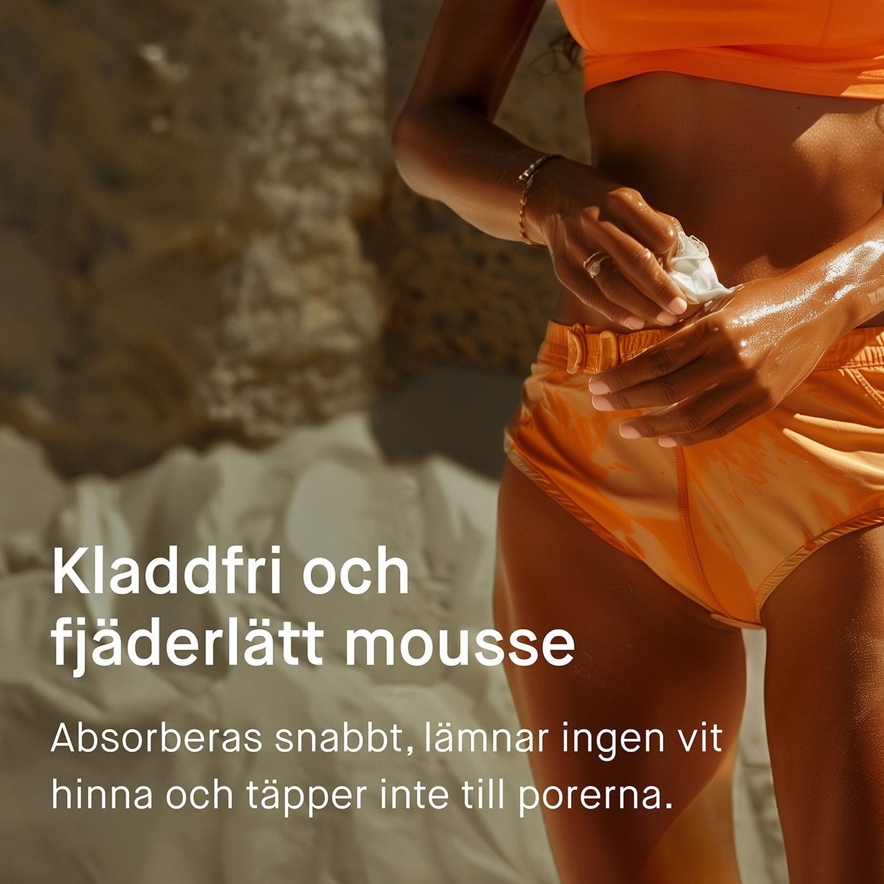 En handfull mousse räcker ungefär till en vuxen arm. Låt produkten torka in ordentligt i några minuter tills huden känns kladdfri innan du badar eller tar på dig kläder. Kom ihåg att för liten mängd produkt reducerar solskyddet avsevärt. Om du har varit i solen länge kan huden behöva extra fukt efteråt med en svalkande aloe vera gel.