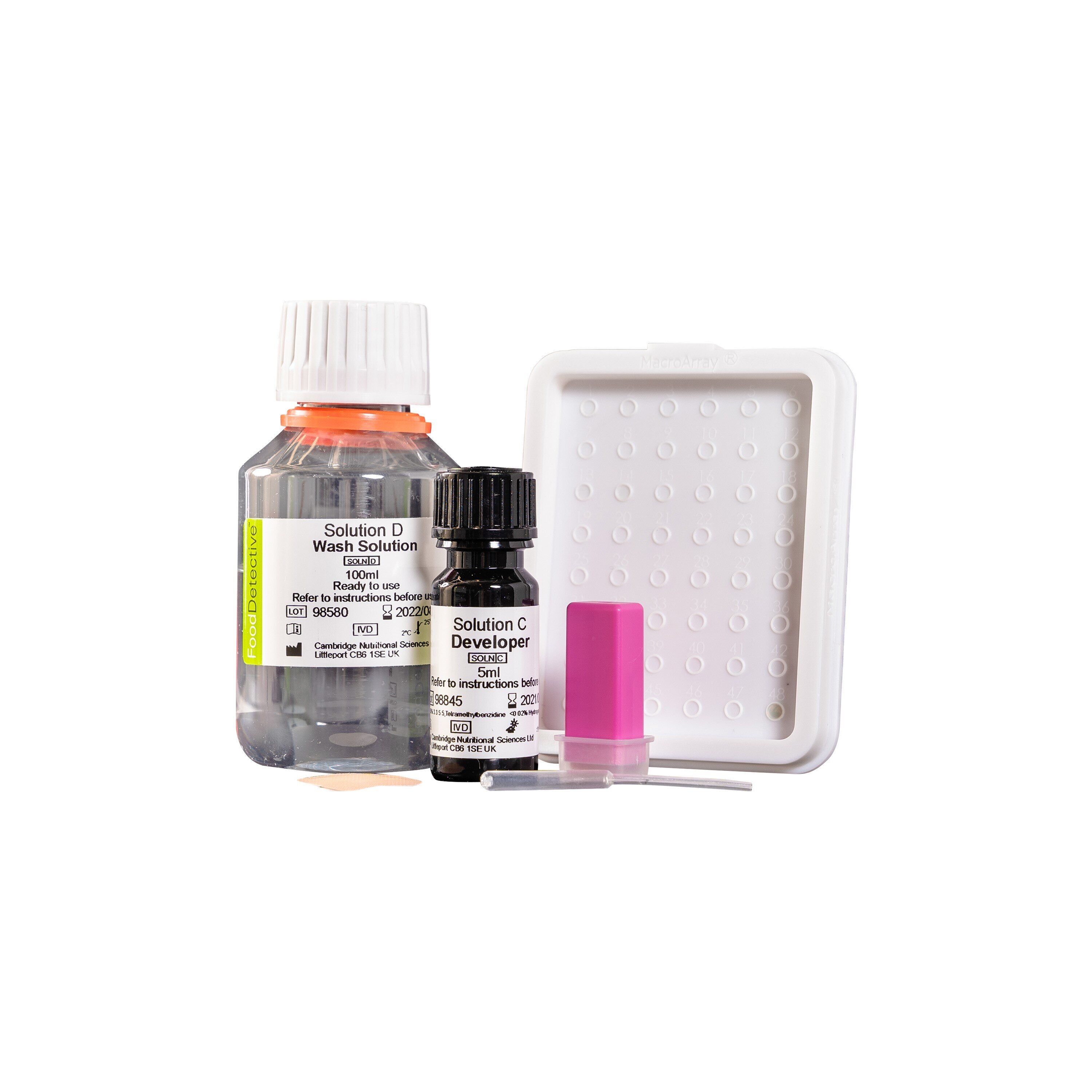 Testar för intolerans på följande livsmedel: Majs, durumvete, gluten, havre, ris, råg, vete, sötvattensfisk (lax, öring), skaldjur (räkor, räkor, krabba, hummer, mussla), tonfisk, vit fisk (kolja, torsk, rödspätta), äpple, svarta vinbär, grapefrukt, melonblandning (cantaloupmelon, vattenmelon), oliv, apelsin & citron, jordgubbar, tomat, nötkött, kyckling, lamm, fläsk, komjölk, ägg (hela), mandel, paranötter, cashewnötter, jordnötter, valnöt, broccoli, kål, morot, selleri, gurka, purjolök, baljväx mix (ärta, lins, gröna bönor), paprika (röd, grön, gul), potatis, sojaböna, kakaobönor, vitlök, ingefära, svamp, te, jäst.