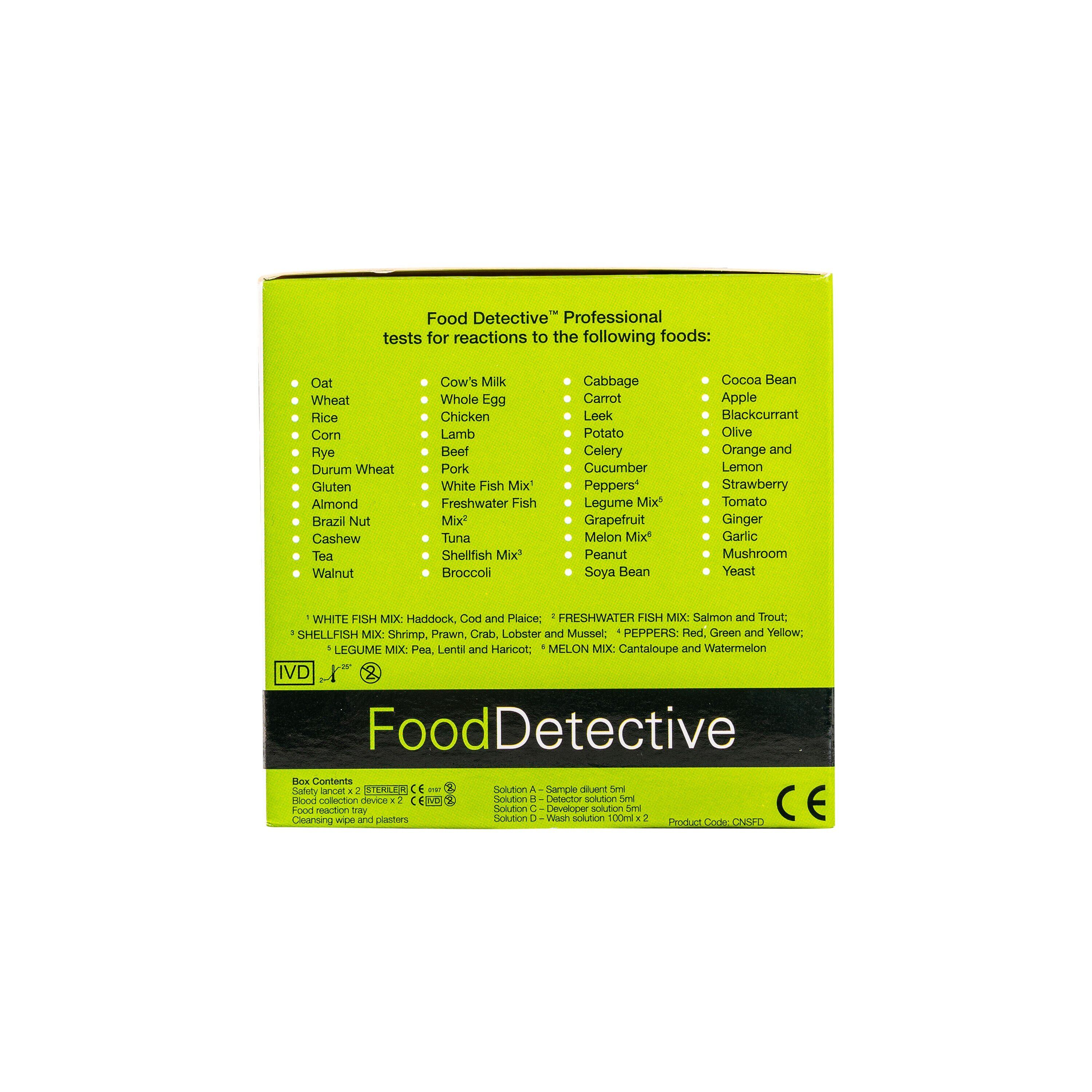 Food Detective® är ett matintoleranstest för IgG-antikroppar* (immunglobulin (typ G)) som kan associeras med matintolerans. Food Detective® använder ELISA-teknik för att detektera närvaron av IgG-antikroppar på dom 59 vanligaste livsmedel. Det finns inget behov av att skicka ditt prov till ett laboratorium eftersom testet kan utföras på plats, vilket ger resultat inom 40 minuter. Testet visar resultat med små blå fläckar om de är positiva och innehåller en kontroll för att identifiera om testet har utförts korrekt eller inte.