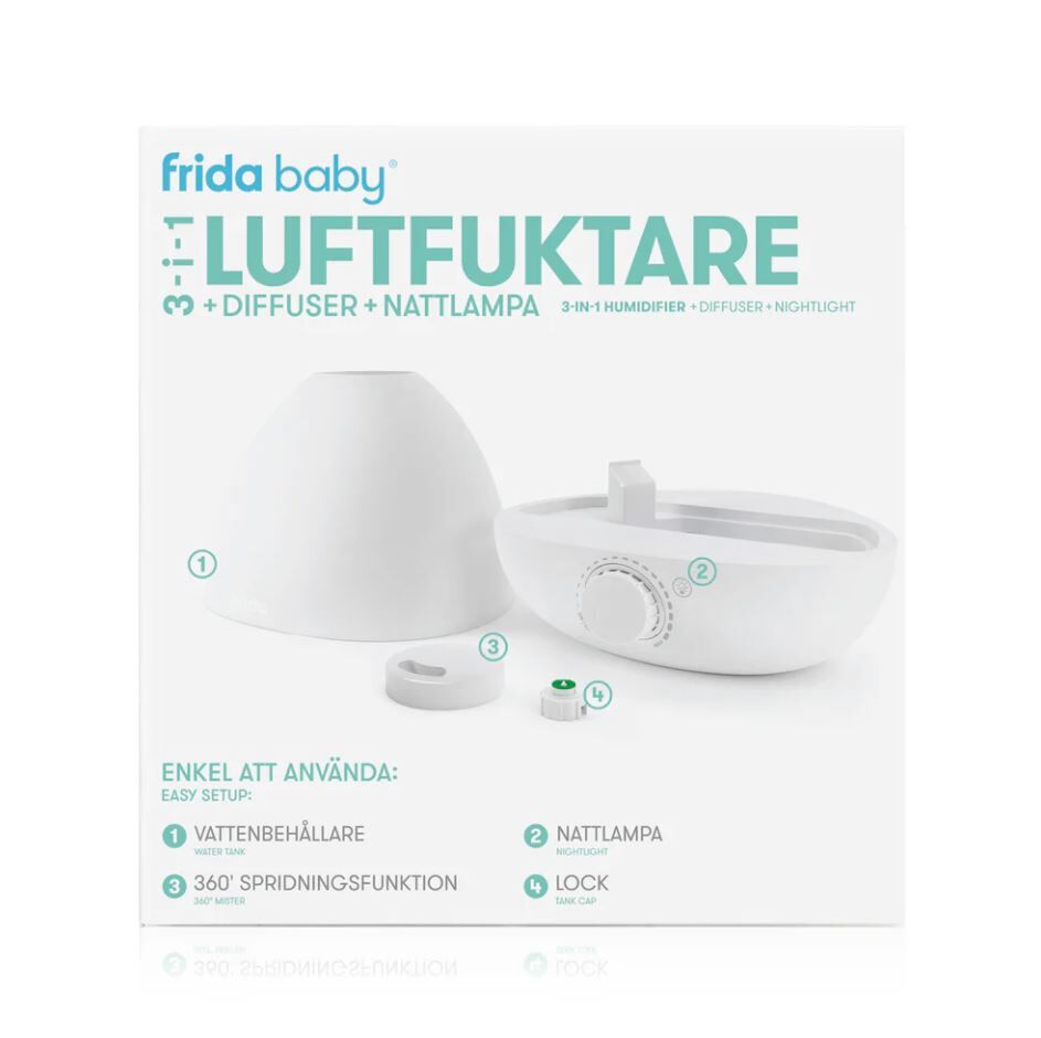 Njut av härlig luftfuktighet skapad av ultraljudsteknik hemma med hjälp av Fridababy 3-i-1 luftfuktare. Koppla av med hjälp av den svala vattenångan, möjligheten att lägga till aromaterapeutiska dofter och lugnt nattljus som skiftar färg. Vattenångan gå från lätt ånga till tropisk regnskog genom att man vrider på ratten. Produkten har en automatisk stopfunktion när vattnet tar slut.