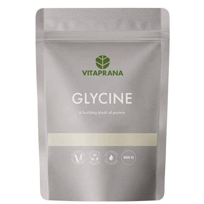 Glycin är en vanligt förekommande aminosyra som återfinns i många viktiga proteiner i kroppen. Glycin är en viktig byggsten i kollagen, glutation och kreatin och aminosyran är därför i konstant omsättning. Glycin, 400 g från Vitaprana är ett enkelt sätt att öka intaget av glycin.