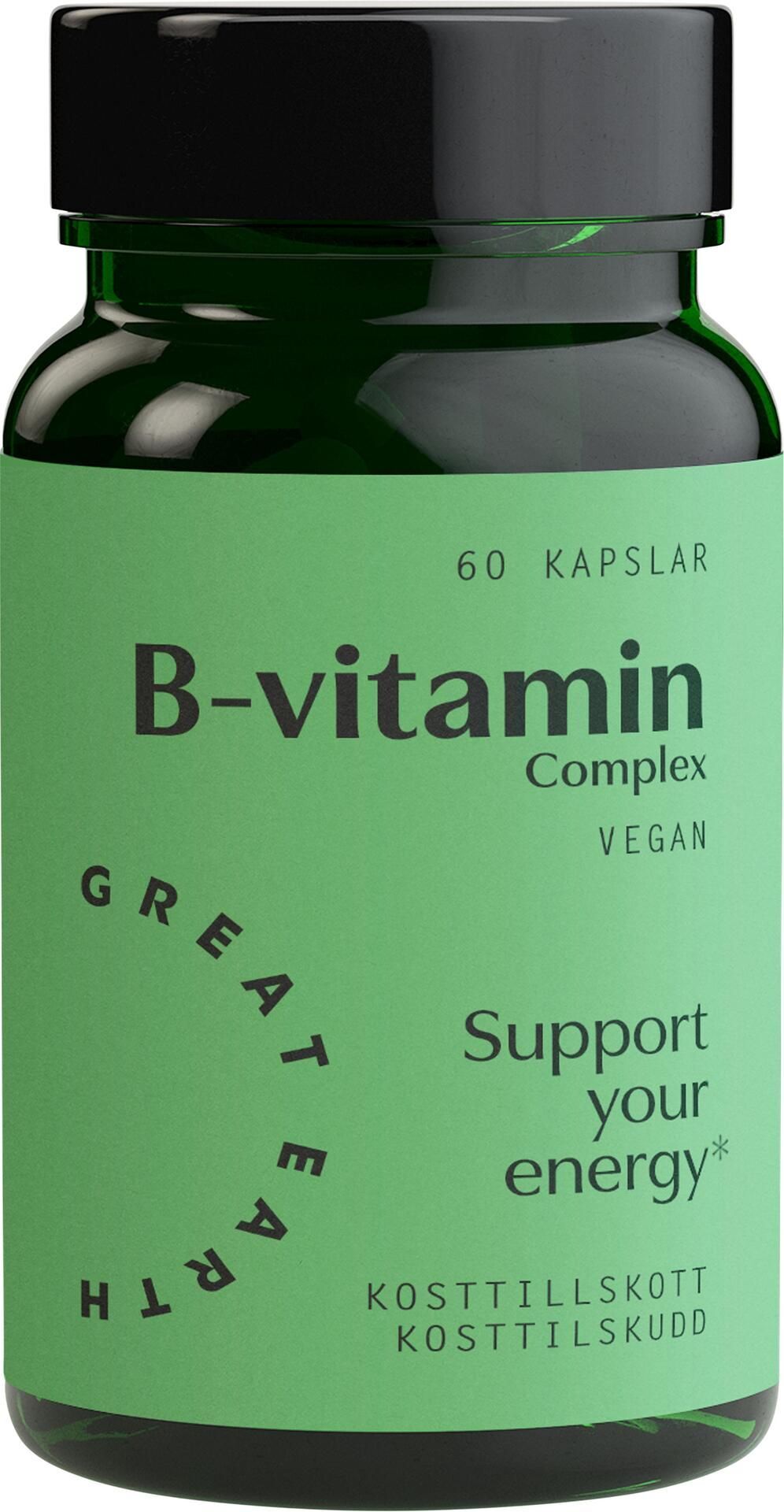 Great Earth B-vitamin Complex innehåller alla 8 essentiella B-vitaminer som din kropp behöver för att fungera på topp. Till exempel bidrar vitamin B2 och B12 till att minska trötthet och utmattning, medan vitamin B1 och B6 bidrar till normal energiomsättning. B-vitaminer som B6 och B12 bidrar även till normal psykologisk funktion. Vitamin B2 och niacin bidrar till att bibehålla normal hud och slemhinnor. Med vårt B-vitamin Complex kan du känna dig piggare, mer fokuserad och redo att ta dig an dagen!