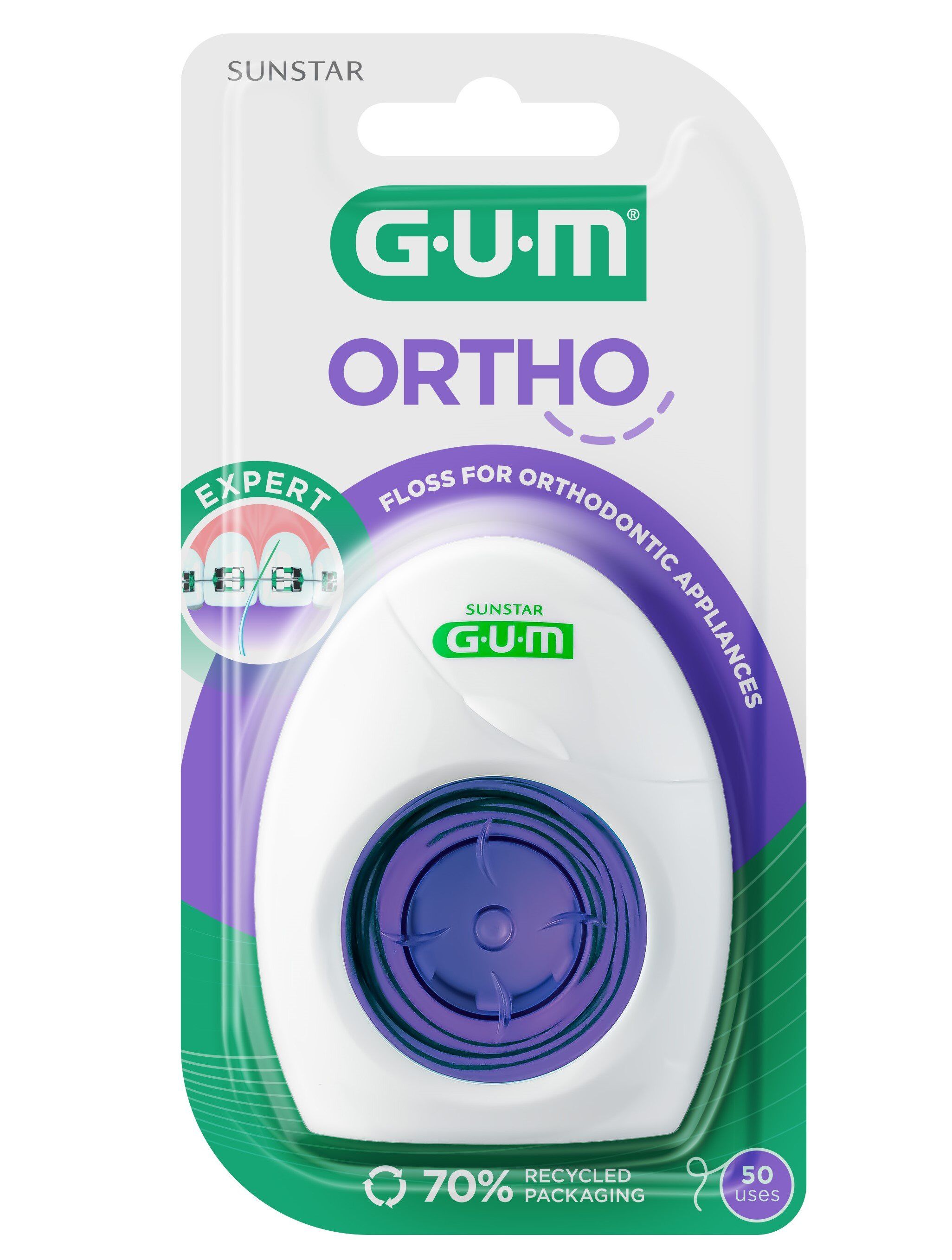 GUM Ortho Floss är en specialanpassad tandtråd som gör det enklare att rengöra noggrant runt tandställning, broar och andra ortodontiska apparaturer.