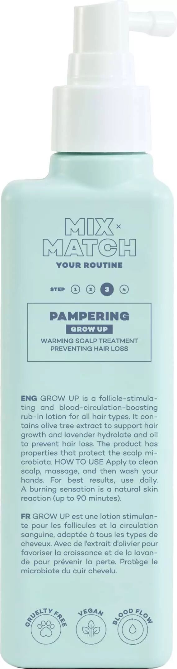 Hairmate Grow Up är en kraftfullt stimulerande scalp lotion framtagen för att optimera förutsättningarna för en hälsosam hårväxt. Genom att aktivt öka blodcirkulationen i hårbotten hjälper produkten till att transportera viktiga näringsämnen till hårsäckarna. Formulan innehåller unika stamcellsextrakt från olivträd som ger direkt stöd till håret under dess tillväxtfas. Dessutom är produkten berikad med lavendelvatten och lavendelolja, ingredienser kända för att motverka håravfall samtidigt som de bidrar med en lugnande, naturlig doft.