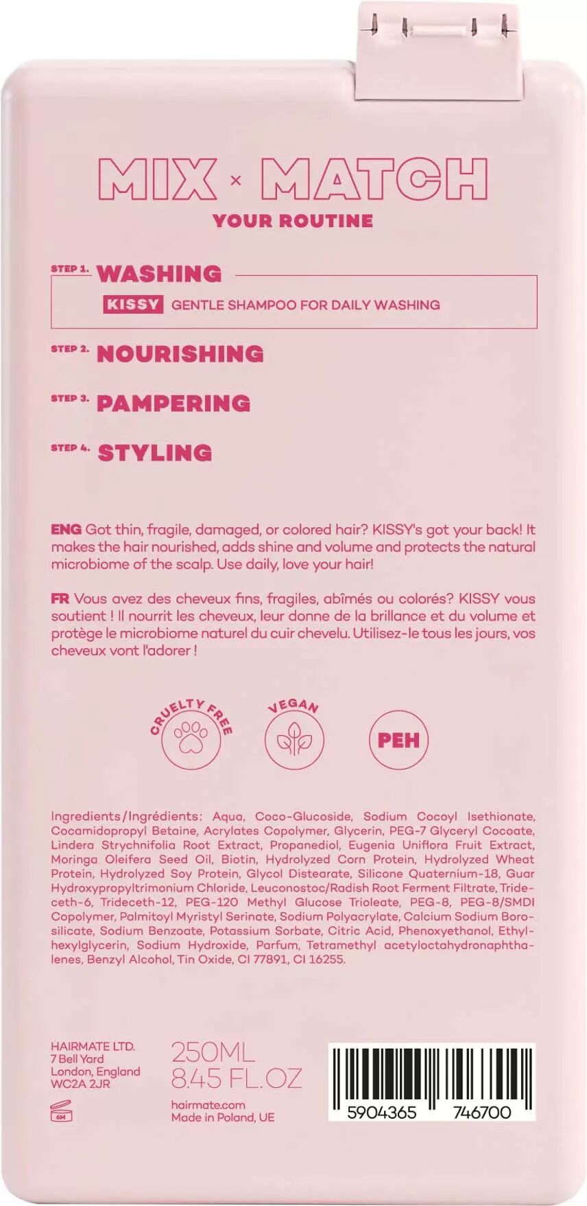 Hairmate Kissy Shampoo är en specialutvecklad rengöring för dig med tunt, skört eller skadat hår som behöver extra omsorg. Formulan ger en mycket skonsam rengöring av både hår och hårbotten samtidigt som den tillför vital näring. Pitangafruktextrakt ger håret en naturlig volymboost och vacker glans, medan moringaolja och innovativa pseudoceramider arbetar för att återställa lipidbalansen. Detta resulterar i ett hår som känns starkare, mer elastiskt och mer motståndskraftigt mot yttre skador.