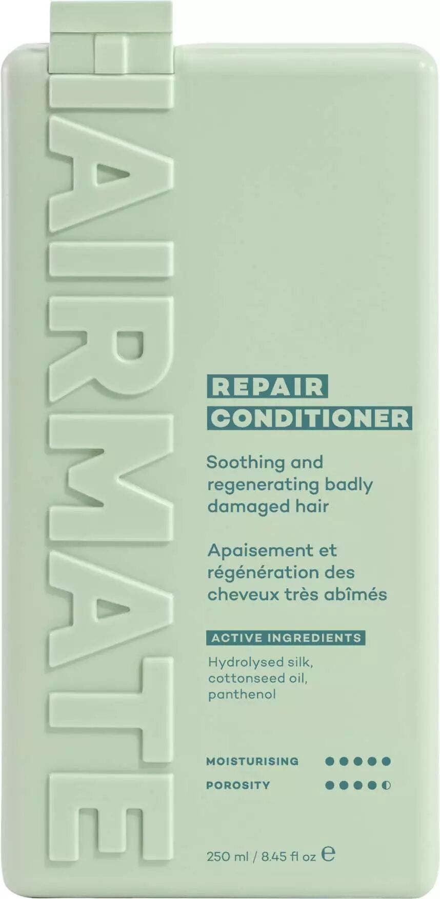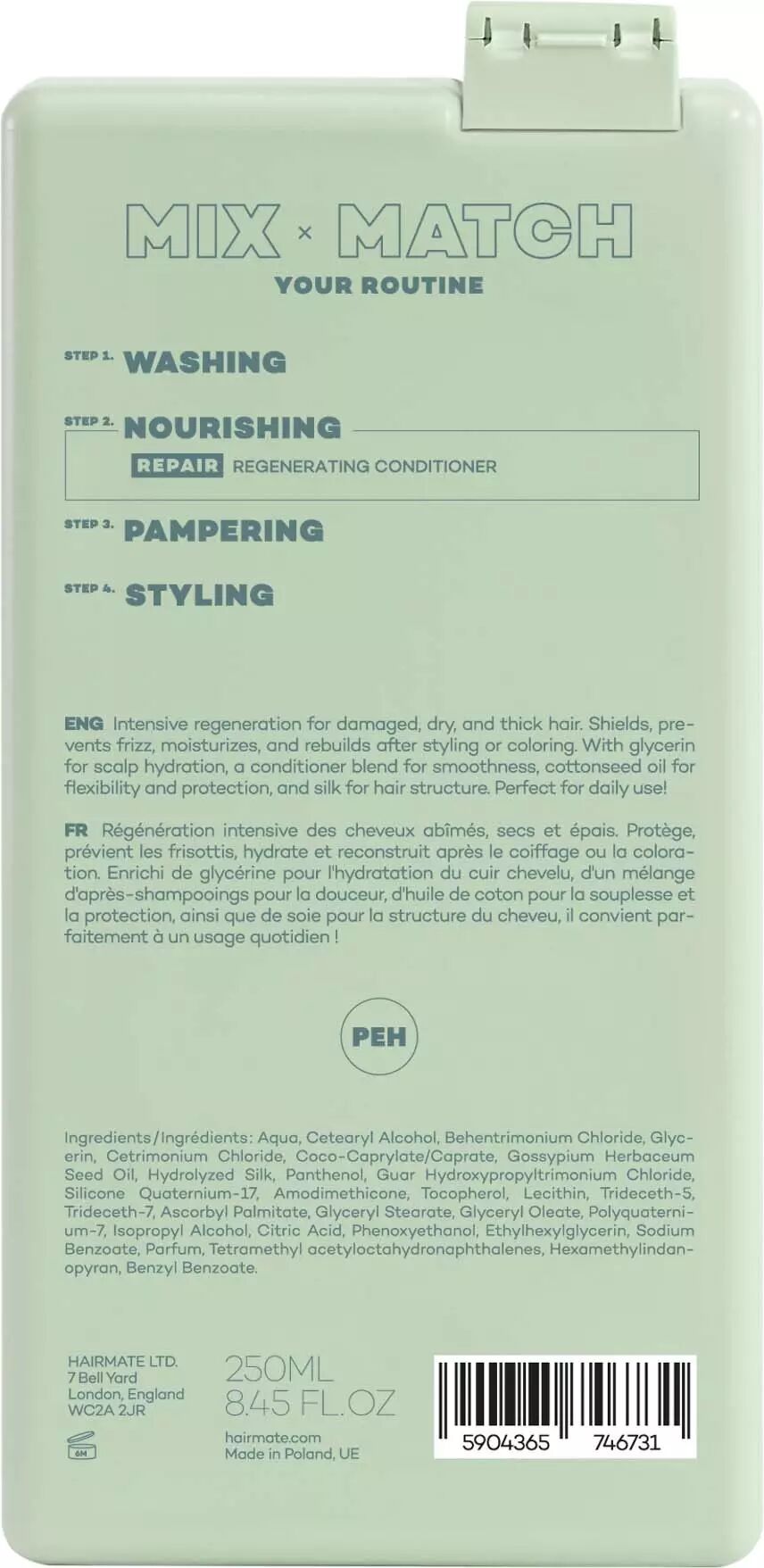 Formulan i Hairmate Repair Conditioner hjälper till att förebygga frissighet och disciplinera svårhanterliga längder. Med ingredienser som silke och bomullsfröolja byggs hårets struktur upp på nytt, vilket resulterar i ett hår som är både lättkammat och strålar av hälsosam glans.