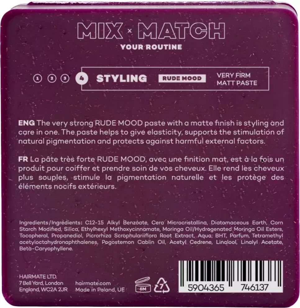 Hairmate Rude Mood är en högpresterande stylingpasta som förenar extrem stadga med djupgående hårvård. Denna kraftigt fixerande pasta är utvecklad för att ge full kontroll över frisyren samtidigt som den bevarar hårets hälsa och elasticitet. Formulan innehåller naturlig kiseljord som effektivt absorberar glans och ger en snygg, matt finish utan att tynga ner håret.