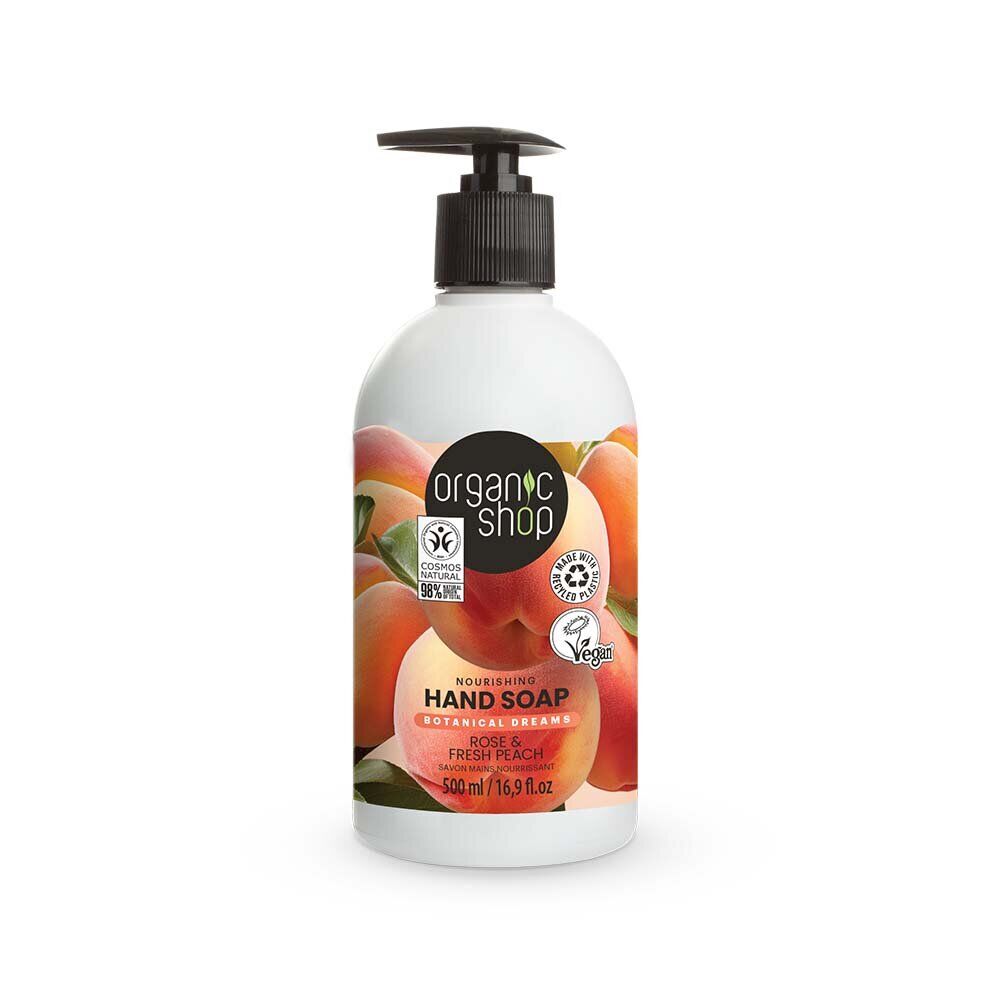 Organic Shop Hand Soap Rose Peach 500 ml är en mjukgörande och återfuktande handtvål med en mild och fräsch doft av rosor och persika. Den är framtagen för att rengöra händerna skonsamt samtidigt som huden får vård och näring. Kombinationen av ekologiskt persika- och rosextrakt bidrar till att huden känns mjuk, frisk och väldoftande efter varje tvätt.