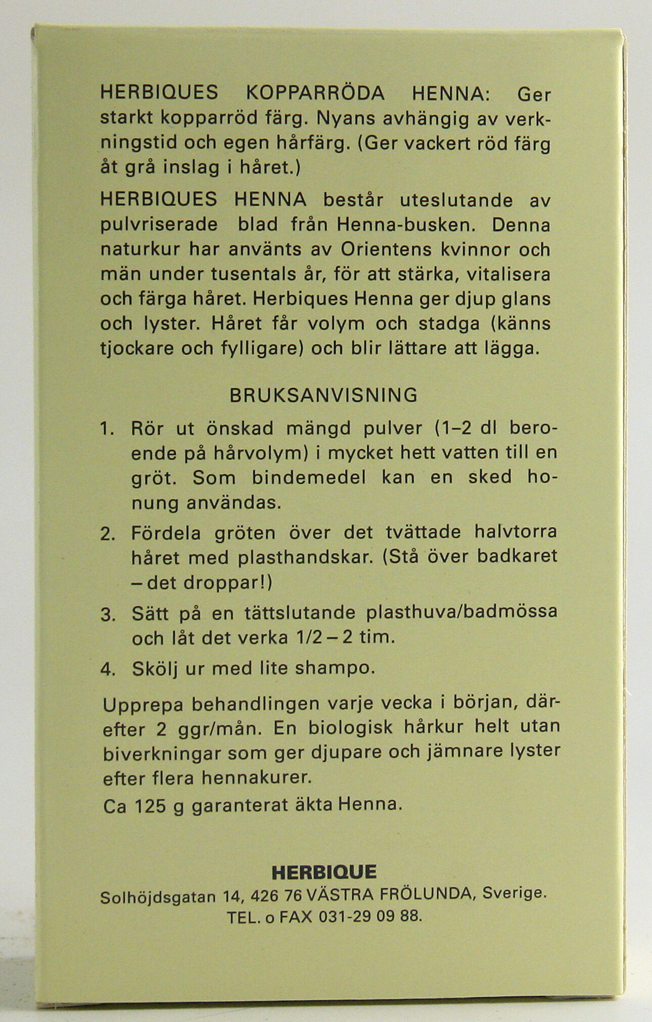 Herbiques Henna består uteslutande av pulviserad blad från Henna-busken. Denna naturkur har använts av orientens kvinnor under tusentals år, för att stärka, vitalisera och färga håret. Herbiques Henna ger djup glans och lyster. Håret får volym och stadga, känns tjockare och fylligare och blir lätt att kamma.