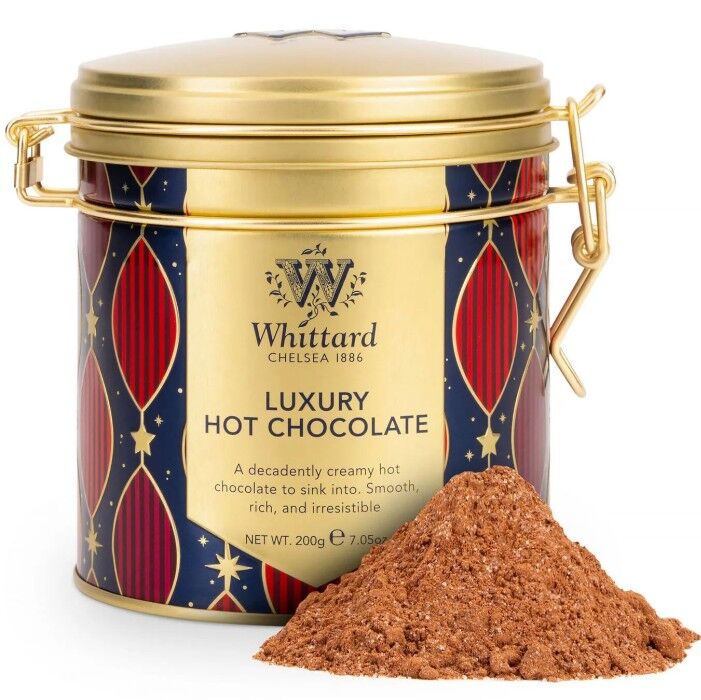 Chokladpulver för varm mjölk i Whittards klassiska vackra plåtburk med snäpplock.