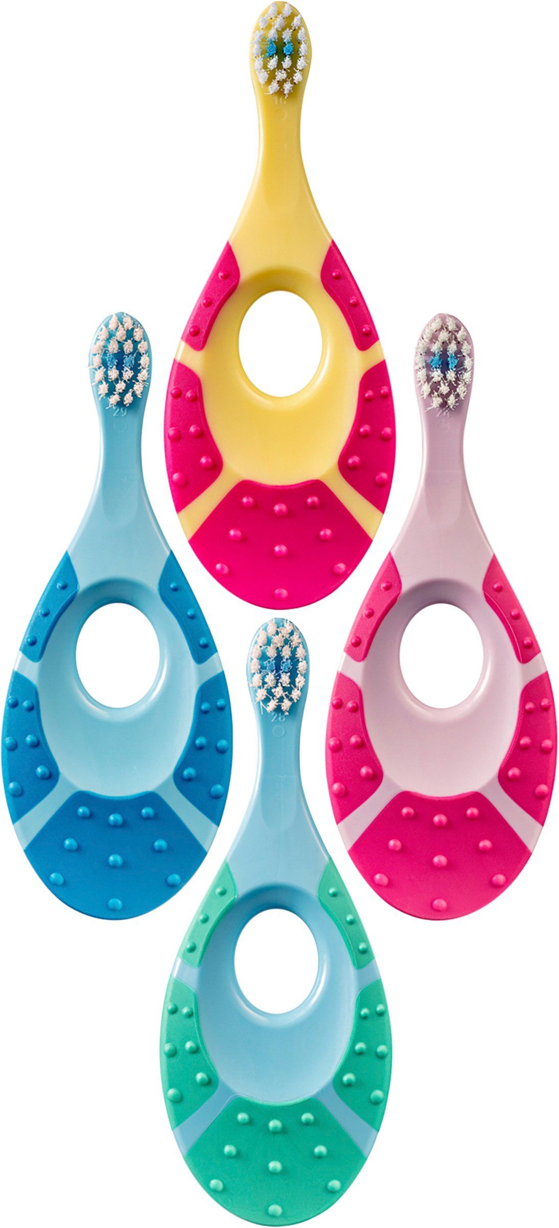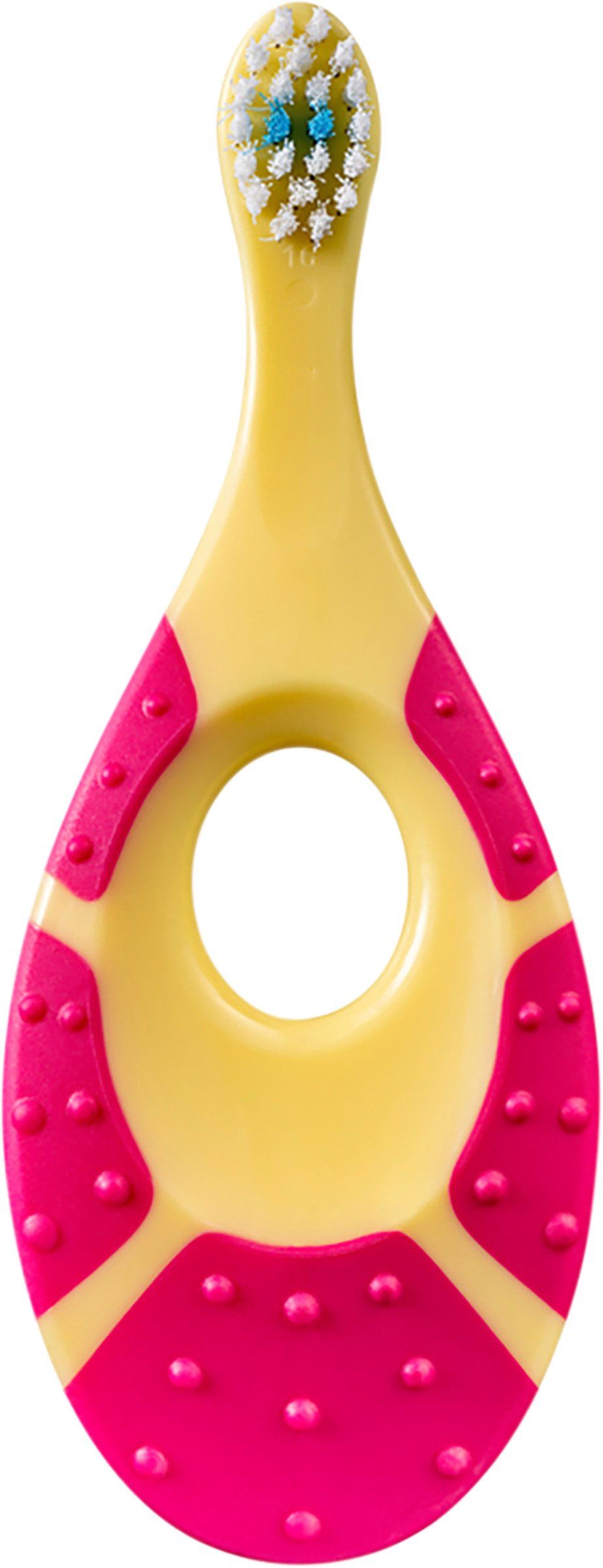 Ett barn får sina första tänder runt 6 månaders ålder. Redan när första tanden börjar sticka ut är det viktigt att börja med tandborstningen för att hålla en god munhälsa. Den här tandborsten har ett mindre borsthuvud som passar små munnar och är dessutom utrustad med mjuka borststrån för att vara skonsam mot tänder och tandkött. Den har en extra kort hals för att minimera risken att hamna för långt ner i svalget. Själva handtaget är inte bara praktiskt att hålla i utan fungerar även som bitring vilket kan vara skönt för barnet när tandköttet är irriterat.