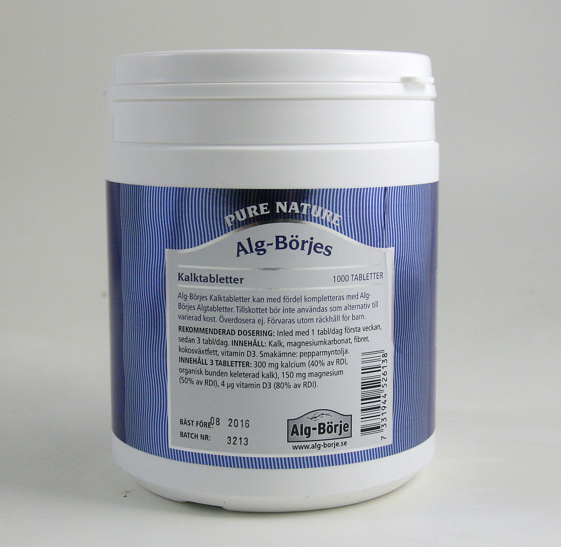Alg-Börjes kalktabletter består av aminosyrekeleterad kalcium och magnesium med vitamin D3. En organiskt bunden (keleterad) kalk ger fullständig upptagning i tarmen. På grund av försurningen så har det mesta av den naturliga kalken i våra åkerjordar försvunnit, därför är det viktigt att tillföra kroppen extra kalk. Kalken verkar basbildande och förebygger benskörhet.