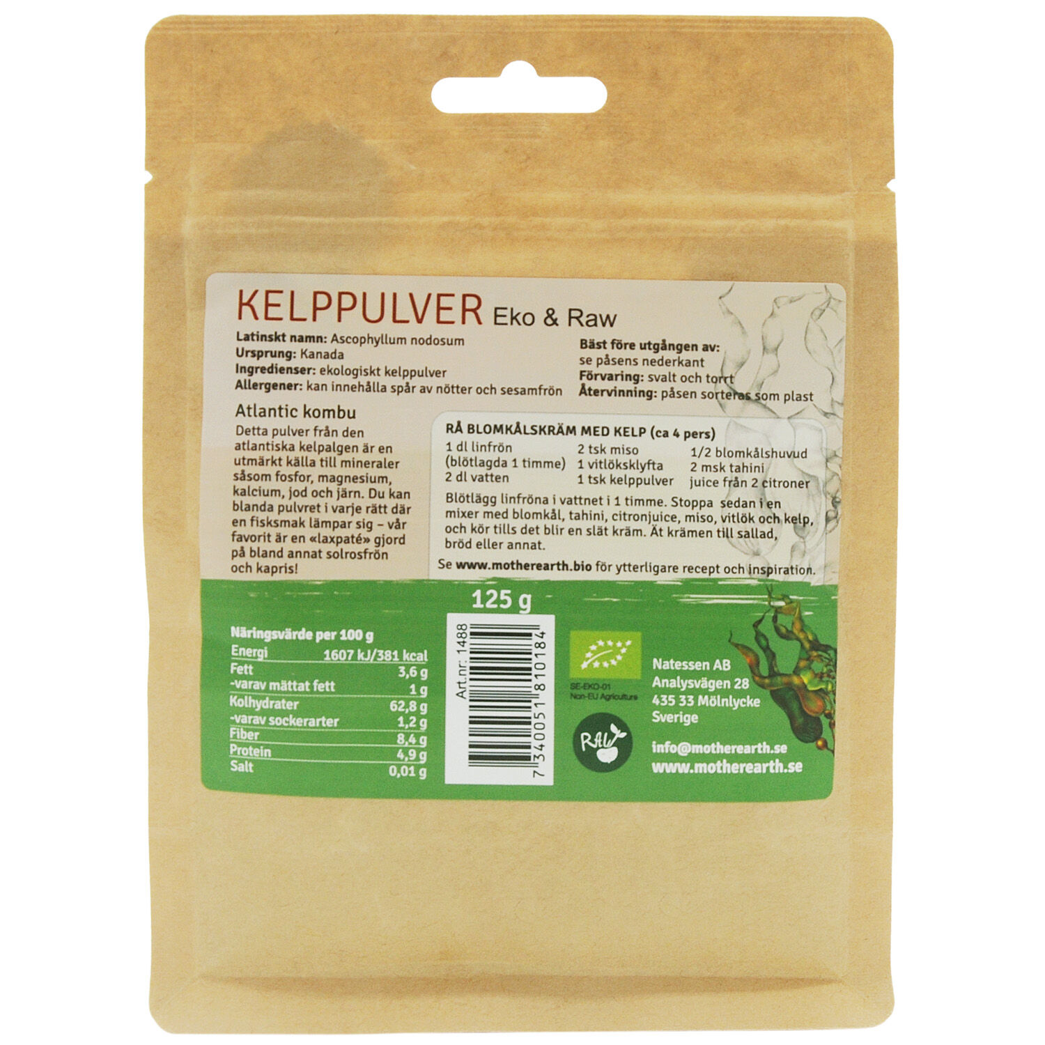 Innehåll: Pulver av torkad kombualg, kelp ( Ascophyllum nodosum) .
