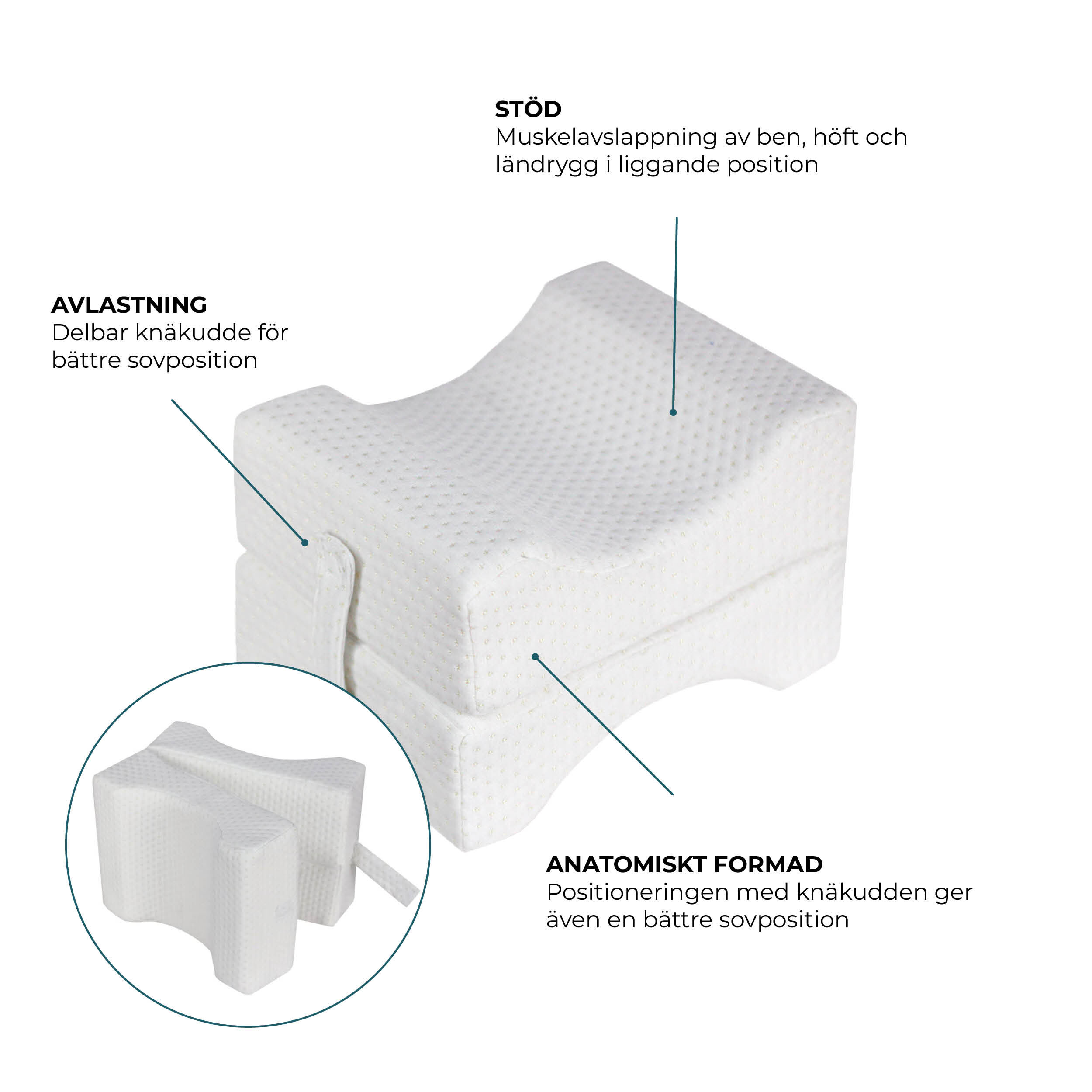 Knäkuddens anatomiska konstruktion skapar en naturlig avlastning och underlättar muskelavslappning av ben, höft och ländrygg i liggande position.
