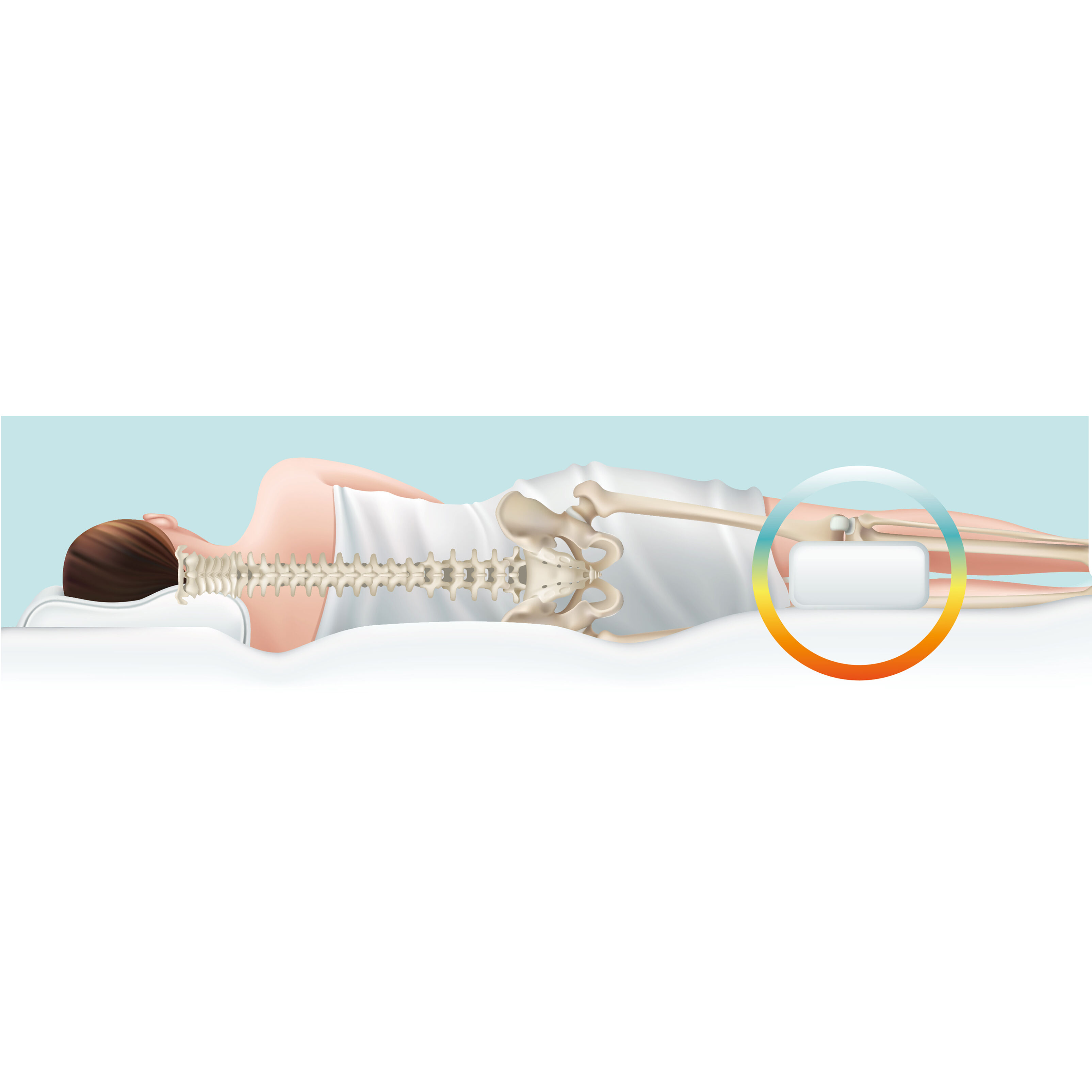 Positioneringen med knäkudden ger även en bättre sovposition och fungerar för alla som vill ha en rakare kroppslinje från rygg, höft ned till knä och foten. Den naturliga linjen skapar avlastning och säkerställer en korrekt position av lårbenen och höften.
