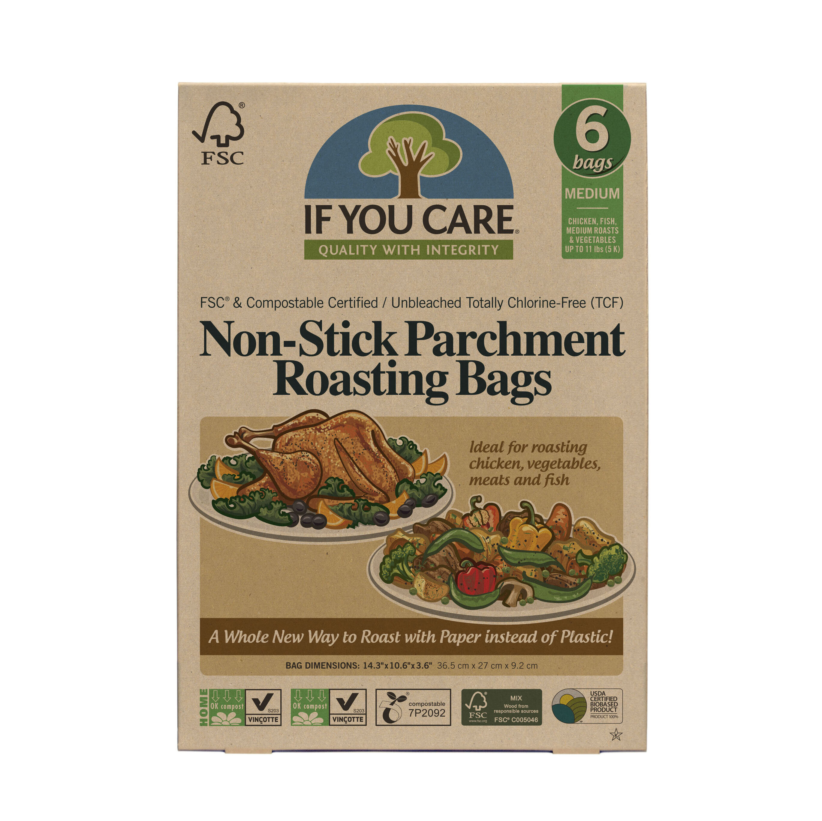 Stora komposterbara, oblekta och FSC-certifierade stekpåsar till fisken, kycklingen eller grönsakerna. Helt fria från klor och quilon. Formarna kan användas i vanlig ugn upp till 220°C och kan även köras i micron. Låt den goda saften stanna kvar och köttet falla av benet med en stekpåse. Påsen är utformad att låta ångan passera ut men låta den goda vätskan stanna kvar. Var dock noga med att inte fylla på med för mycket vätska då den inte är helt läckagesäker. Förpackningarna är tillverkade av återvunnen kartong och vegetabiliskt tryck.