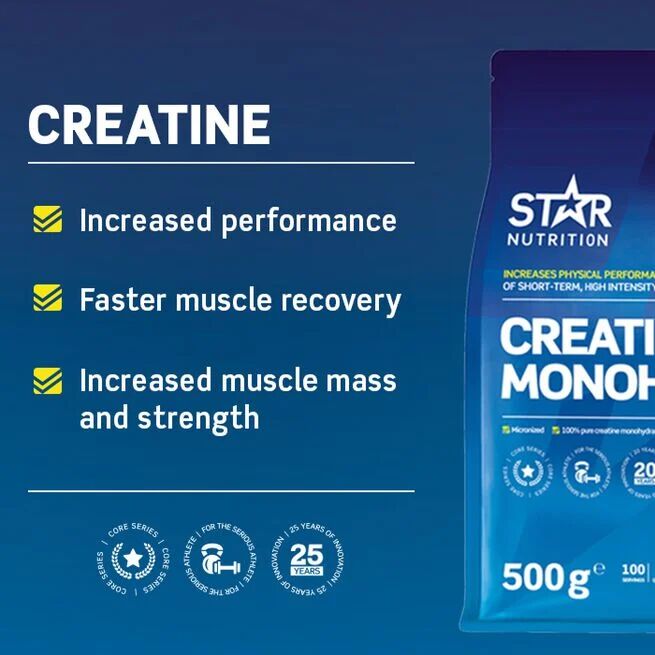 Kreatin är bevisat att öka den fysiska prestationen vid upprepade kraftansträngningar så som styrketräning. Denna effekt uppnås vid ett dagligt intag på 3 gram kreatin vilket du med lätthet kommer upp i med Creatine Monohydrate från Star Nutrition.
