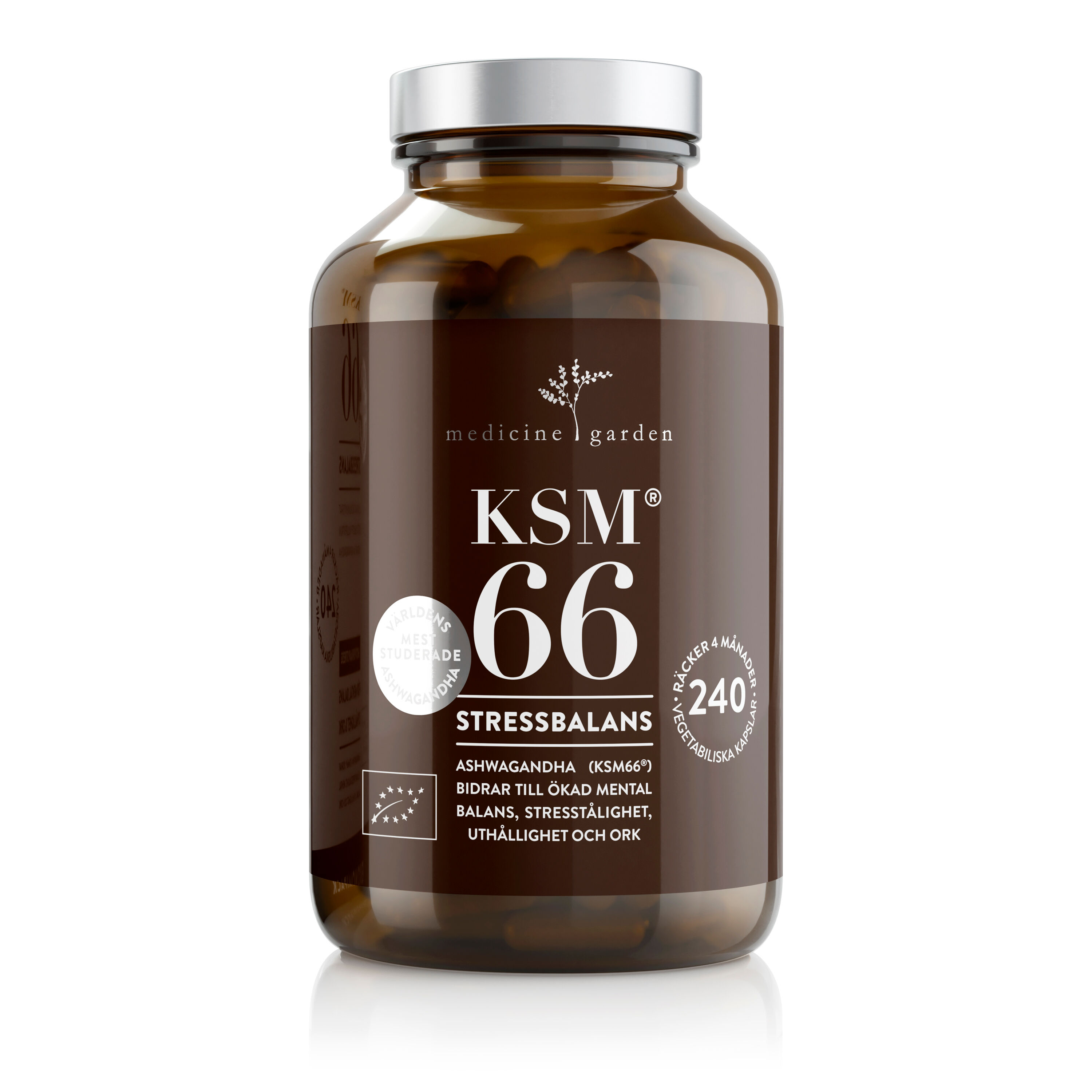 KSM66® är ett ekologiskt odlat Ashwagandha-extrakt, extraherat med en miljövänlig teknik som utvecklats under 14 år (Green Chemistry). På så sätt får man ett naturligt, fullspektrum-extrakt som innehåller rotens hela naturliga komplex av aktiva ämnen, både vatten- och fettlösliga, men tio gånger mer koncentrerat än den torkade roten.