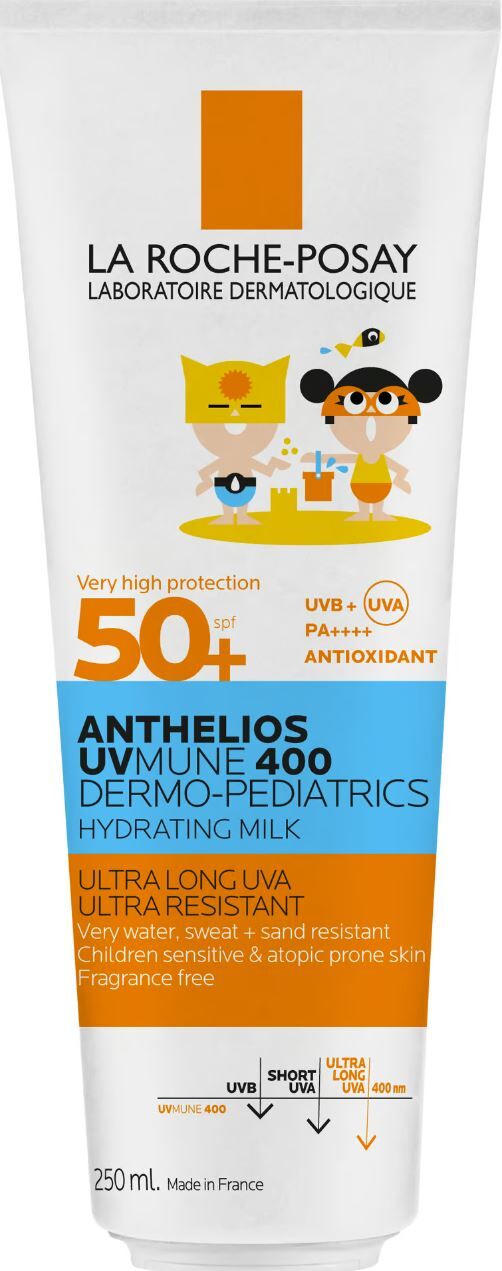 Anthelios UVMune 400 Kids Hydrating Milk SPF 50+ har ett mycket högt skydd och skydd mot ultralånga UVA-strålar* för kropp och ansikte. Anpassad för barns hud och deras aktivitetsnivå. Hypoallergen. Extra vattenresistent. Enkel att applicera. Ger ingen fet känsla. Testad under kontroll av dermatolog och barnläkare. Utan parfym.