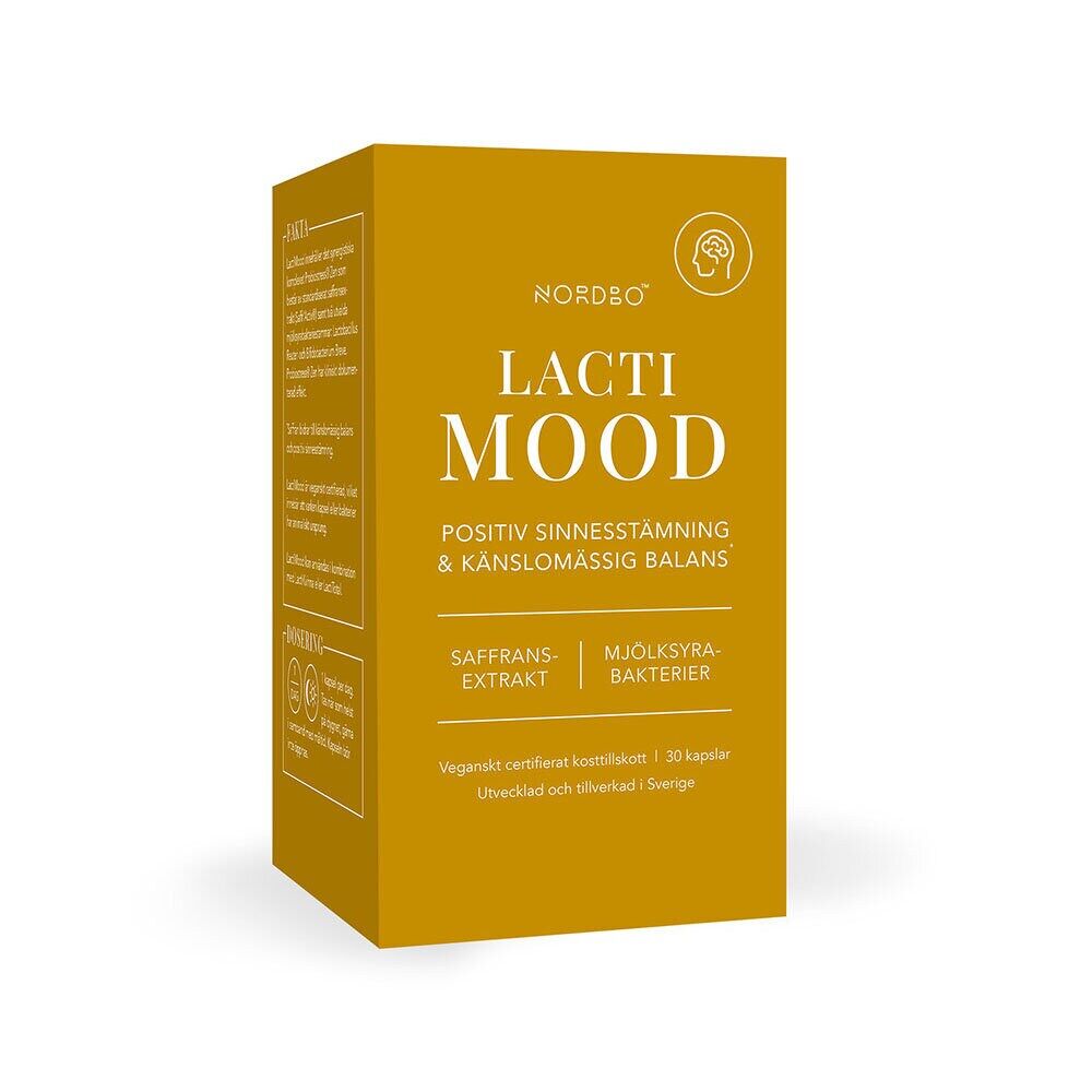 NORDBO LactiMood är ett svenskt kosttillskott som kombinerar det patenterade komplexet Probiostress® – en synergistisk blandning av standardiserat saffransextrakt (Saffr’Activ®) samt 4 miljarder levande mjölksyrabakterier från stammarna Lactobacillus reuterioch Bifidobacterium breve.