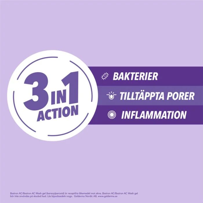Basiron AC är Sveriges mest sålda receptfria läkemedel för behandling av akne (finnar). Gelen innehåller den aktiva substansen bensoylperoxid som angriper akne på två sätt: den har en direkt bakteriedödande effekt på aknebakterien Propionibacterium acnes och verkar samtidigt avfjällande på huden. Genom denna dubbelverkan avlägsnas överskottet av hornämne som annars täpper till talgsäckarna och orsakar orenheter. AC i produktnamnet står för Akrylat Copolymer, ett ämne som ingår i formulan för att hjälpa till att balansera huden under behandlingen. Du hittar Basiron AC gel 10 % och andra produkter från Basiron här hos bonmed.