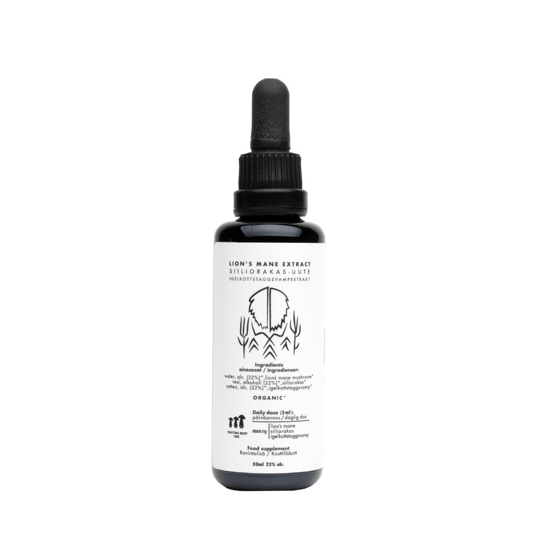 KÄÄPÄ Mushrooms högkvalitativa vatten- och alkoholextrakt av igelkottstaggsvamp, dvs. Lion’s mane (Hericium erinaceus) är odlad i Finland. KÄÄPÄ Mushrooms produkter är fullständigt ekologiska, och svamparna är odlade med finsk PEFC/FSC certifierad björk som växtunderlag.