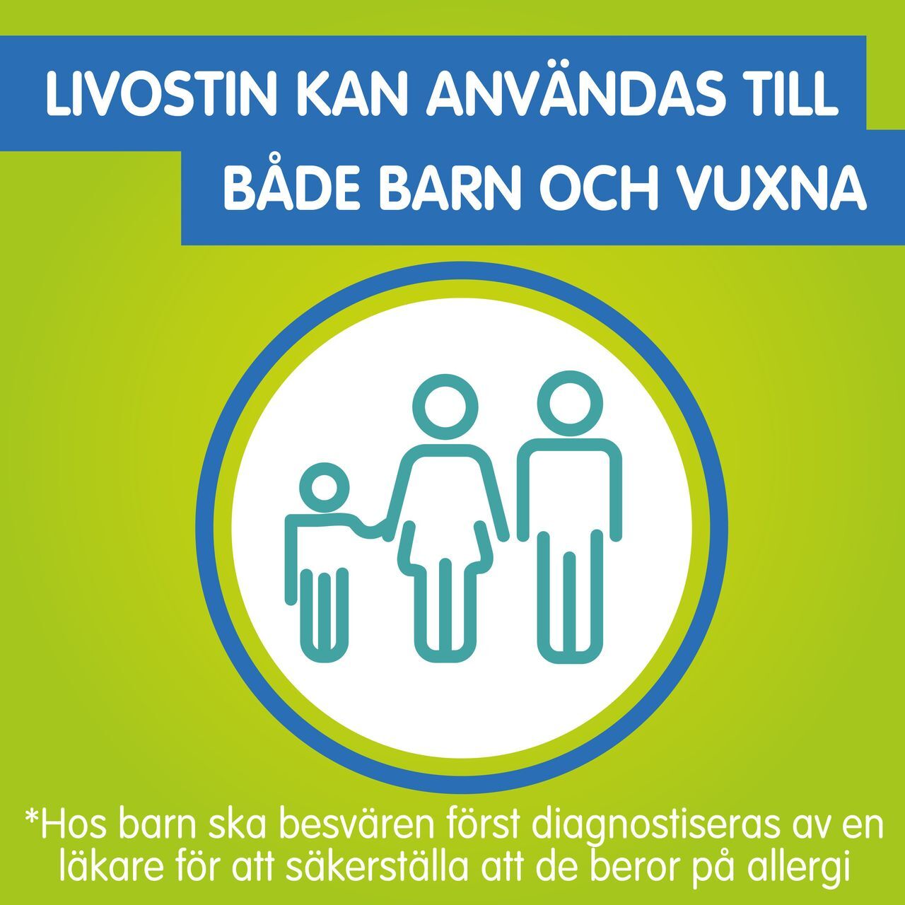 Livostin kan användas av både vuxna och av barn men barnet ska först ha diagnostiserats av en läkare för att säkerställa att besvären beror på allergi.