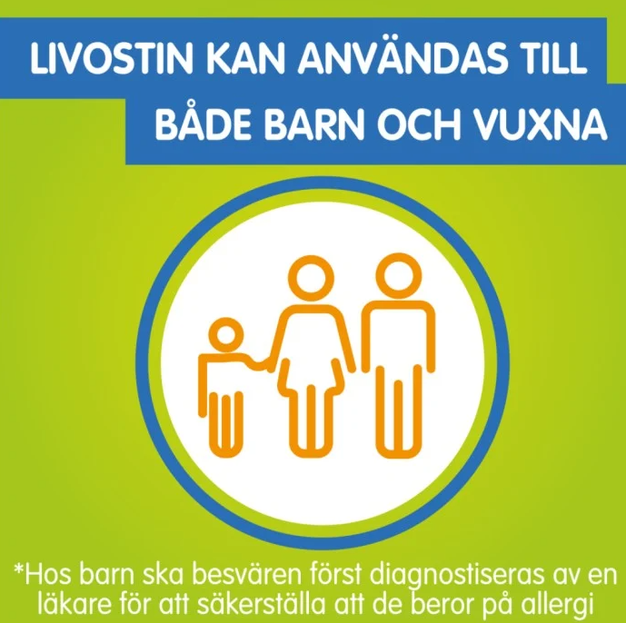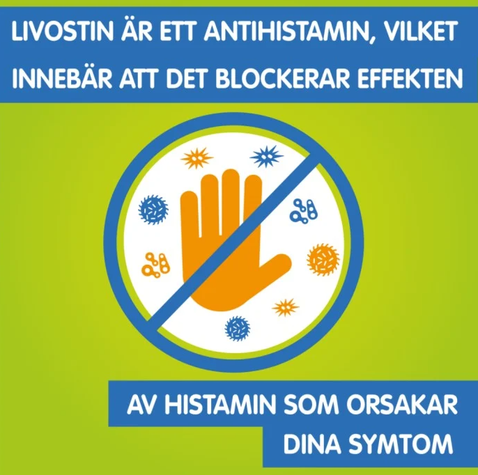 Livostin ögondroppar används som korttidsbehandling för att lindra symtom vid pollenallergi. Många blir drabbade av röda, kliande, rinnande och svullna ögon under de varmare månaderna på året på grund av att spridningen av pollen ökar markant. Det är histamin som orsakar dessa typiska ögonbesvär och Livostin hjälper till att motverka den allergiska reaktionen genom att blockera effekten av just histamin. Produkten verkar efter cirka 15 minuter. För vuxna och barn. Barn bör diagnostiseras av läkare.