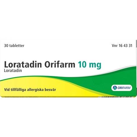 Loratadin Orifarm 10 mg tabletter är receptfritt för vuxna och barn över 6 år (med en kroppsvikt över 30 kg) vid allergiska besvär i näsa och ögon. De allergiska besvären kan orsakas av bl.a. pollen, kvalster eller damm. Symtomen kan vara rinnsnuva, nästäppa och nysningar och/eller röda, rinnande kliande ögon.