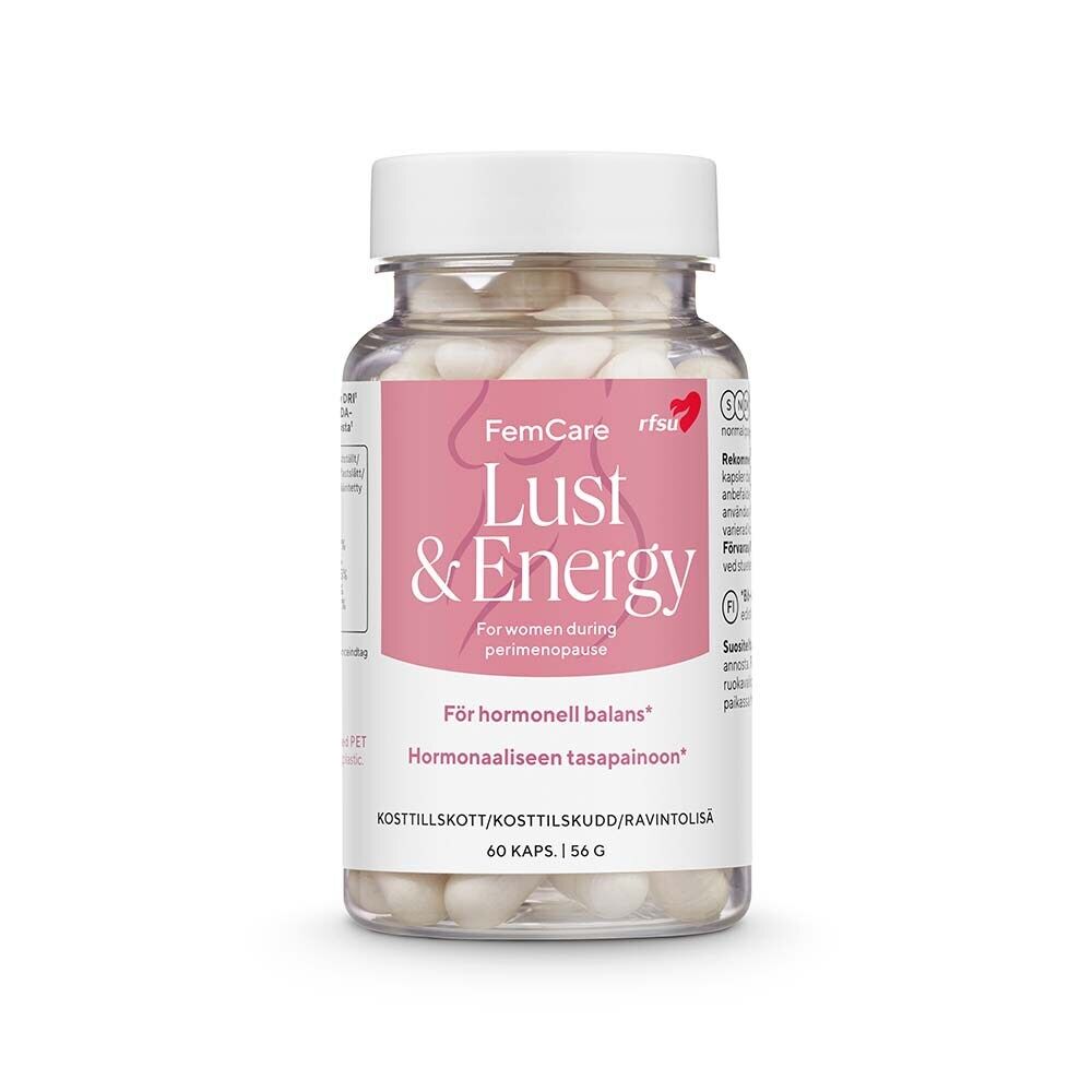 RFSU Lust & Energy är ett veganskt kosttillskott speciellt framtaget för kvinnor som närmar sig eller befinner sig i klimakteriet. Produkten stödjer hormonell balans, mental välmående, samt motverkar trötthet och energibrist. Kombinationen av L-Arginin, L-Citrullin, Vitamin B6 & B12, samt Magnesium bidrar till att reglera hormoner, öka energinivåer och lust samt bibehålla hudens normala funktion.