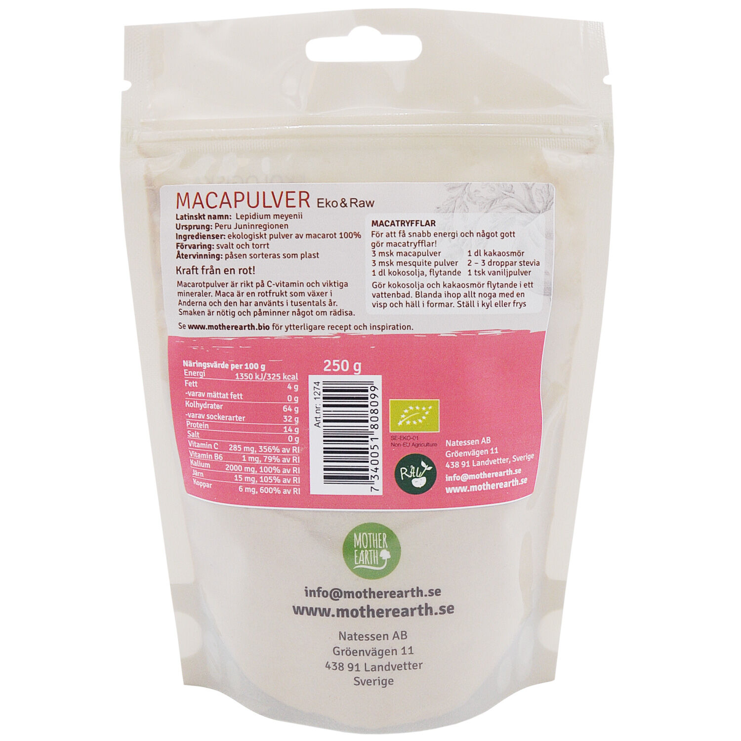 Vår maca odlas av familjekooperativ i Anderna (Juninregionen) och är av högsta kvalitet. Maca innehåller flera essentiela aminosyror samt vitamin C, B1, B2, B3, B6, och även till kalcium, järn, fosfor. Dessutom spårämnen som koppar och mangan.