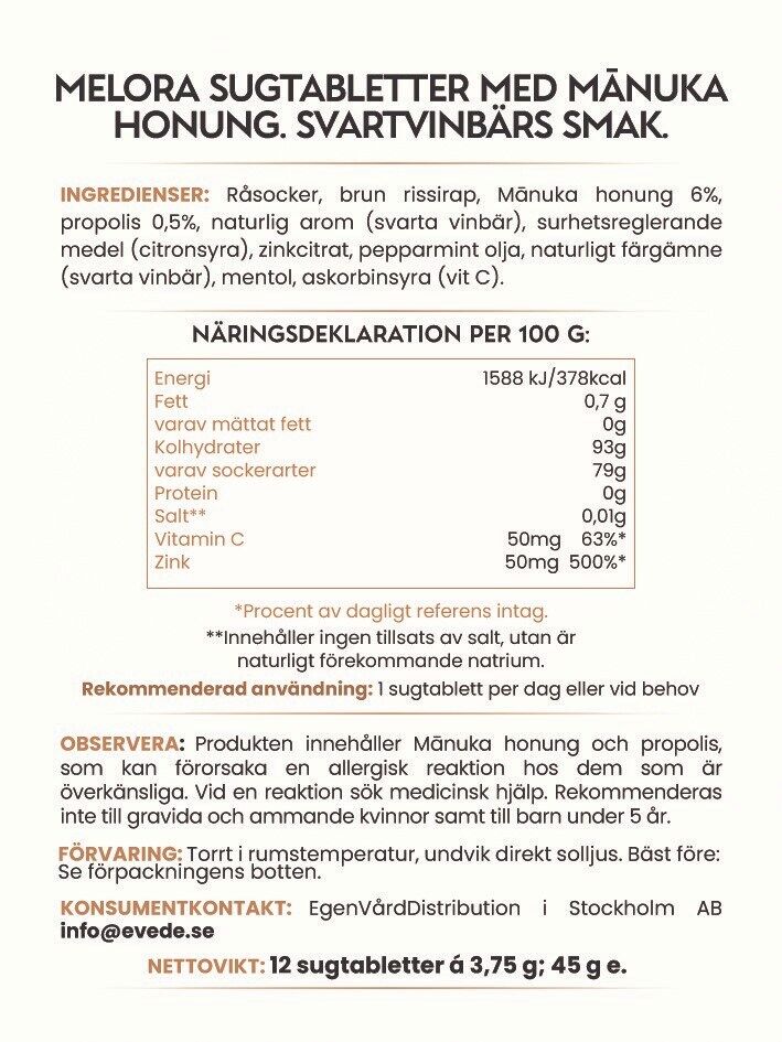 Halstabletter från Melora, med manukahonung av hög kvalitet och svartvinbärssmak. Speciellt utvalda ingredienser för att hjälpa mot halsont och lindra hosta. Innehåller propolis, mentol, pepparmyntsolja, vitaminer och mineraler.