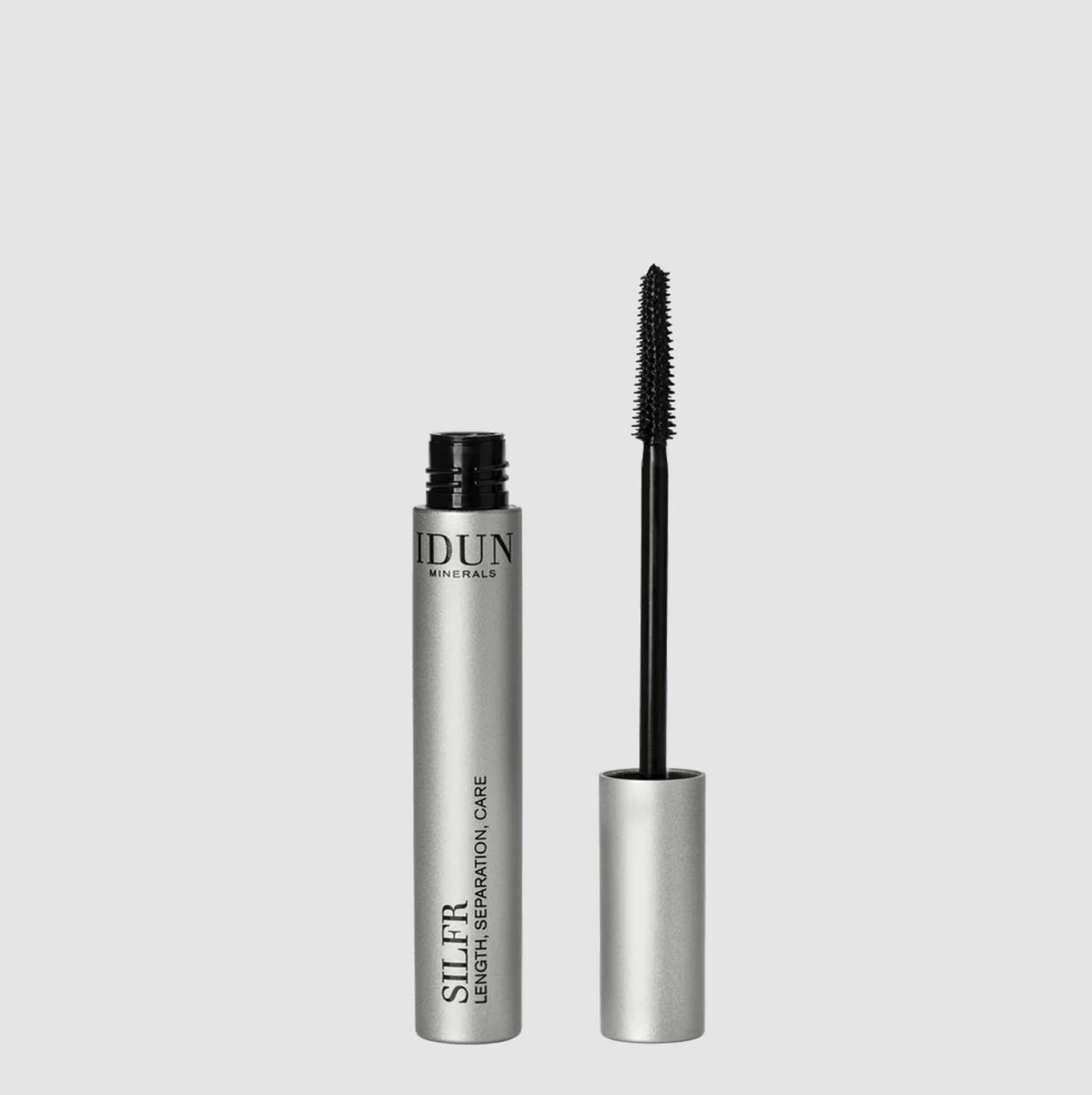 Förlängande mascara med en intensiv svart eller brun färg. IDUN Minerals Silfr har en krämig formula som är berikad med högrenade mineraler som ger långa, separerade fransar som inte klumpar eller fäller under dagen. Den flexibla och avsmalnande gummiborsten kommer åt även de kortaste fransarna och fördelar den krämiga formulan på varje frans samtidigt som den separerar och formar dem.